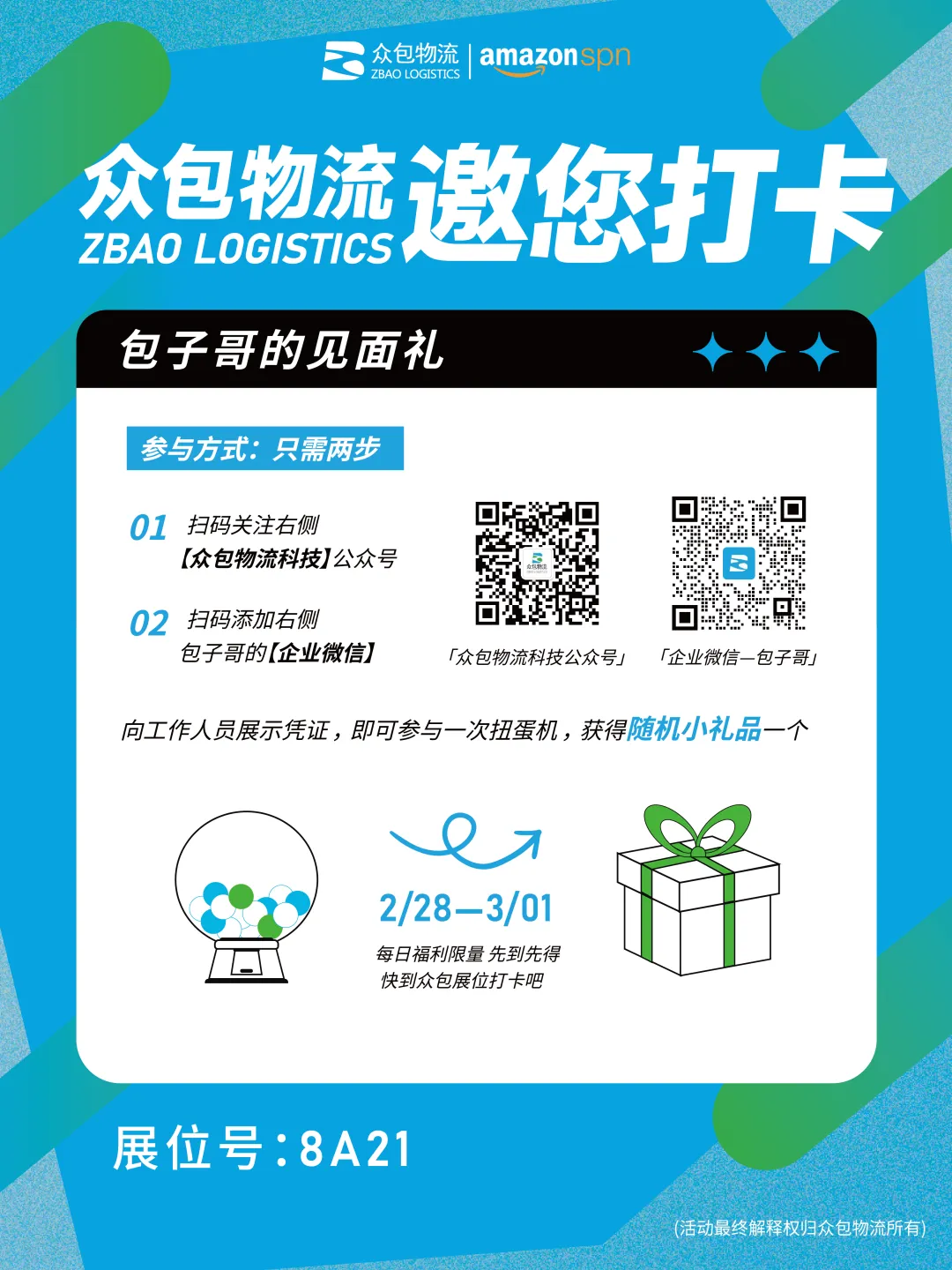 展会期间,众包物流展位专属福利来袭!包子哥为到场的朋友们准备了精美见面礼,参与方式超简单:关注众包物流公众号 + 添加包子哥微信,即可参与扭蛋机抽奖1次,精美小礼品随机送,到场即享,不容错过!