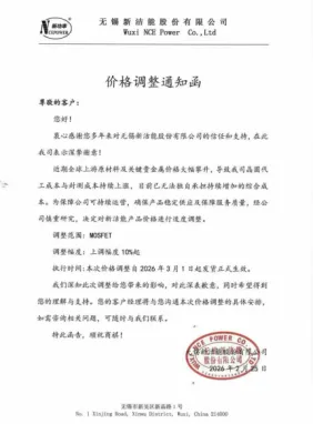 近期,国内功率半导体行业掀起一轮显著的涨价潮。无锡新洁能股份有限公司与宏微科技等多家国产芯片企业相继发布产品价格调整通知函,宣布自2026年3月1日起,对旗下多款核心产品执行价格上调,涨幅普遍在10%及以上。
