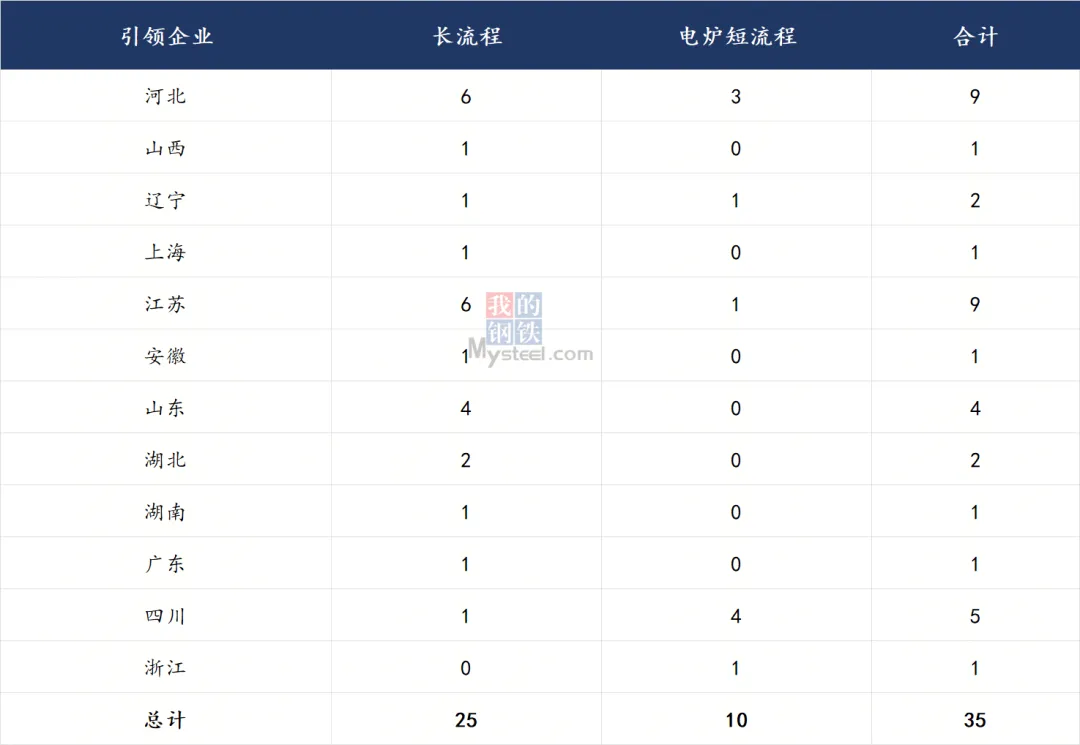 从公示的引领型规范企业类型来看,合计公示35家,其中长流程企业25家,短流程企业10家;按照省份来看,河北、江苏、四川等省份公示企业最多,山西、上海、安徽、湖南、广东、浙江各有1家引领企业。