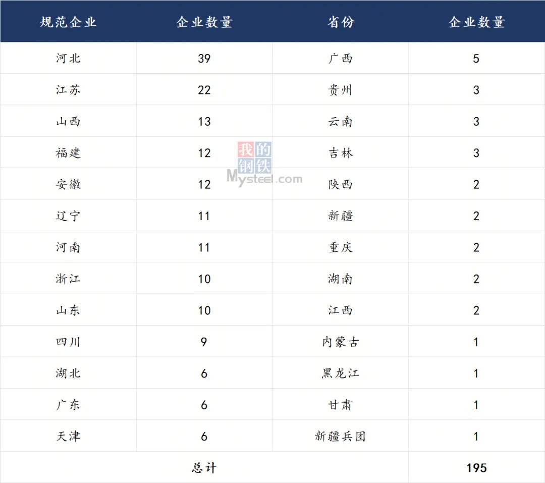 从公示的规范企业类型来看,合计公示195家,其中河北、江苏、山西、福建、安徽省份公示企业最多,分别为39、22、13、12、12家;内蒙古、黑龙江、甘肃及新疆兵团各有1家规范企业进行公示。