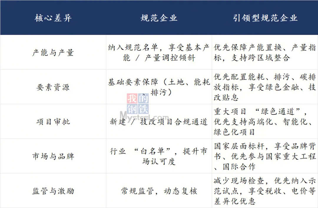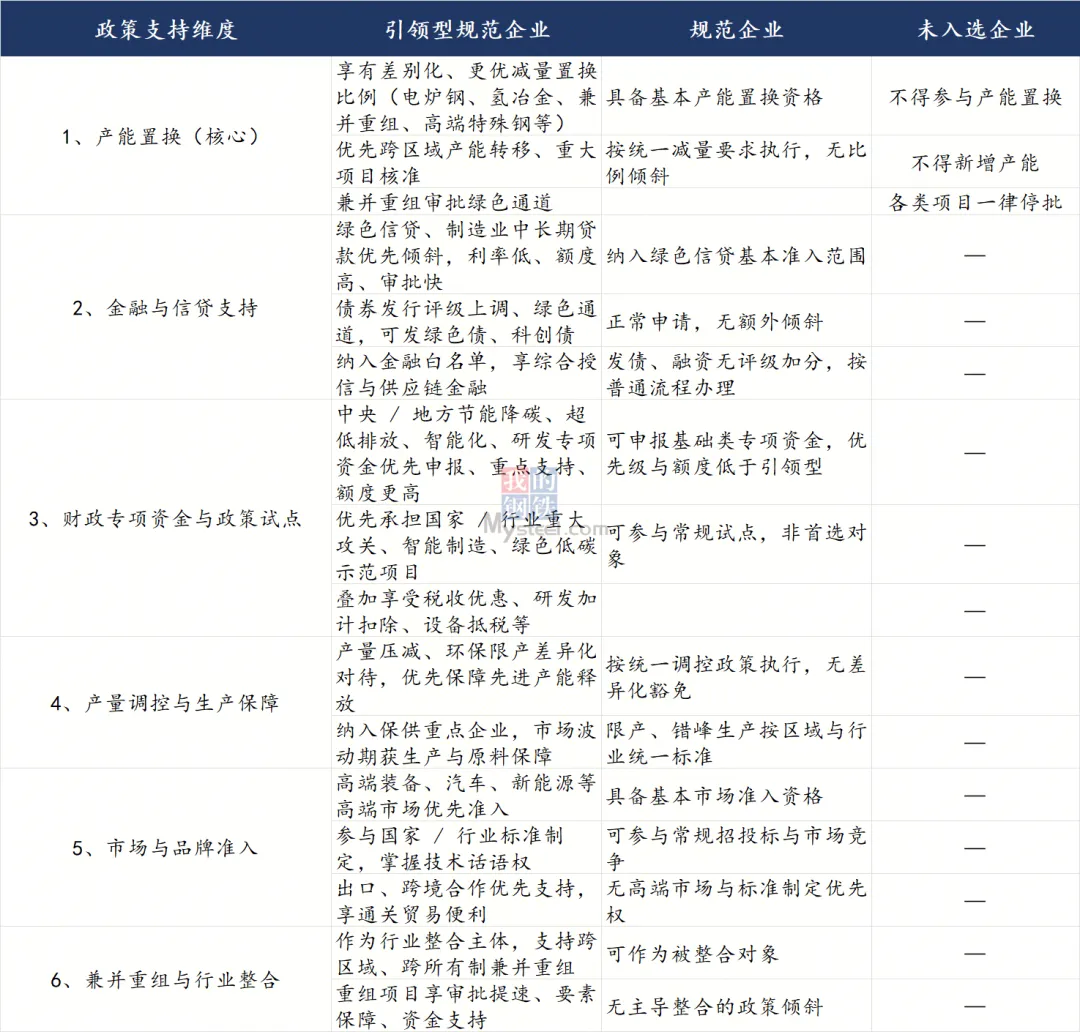 首次实施规范企业(基础达标)+ 引领型规范企业(标杆引领)两级评价,配套差异化政策支持。规范企业作为行业基础门槛,包含6大一级指标及20项二级指标:涵盖基本要求、工艺装备、环保、资源消耗、安全、质量,并覆盖产能合规、排污许可、能效、安全事故、质量体系等,必须全部达标;作为引领型规范企业,则有更高的标杆要求,除了6大一级指标高端化、智能化、绿色化、高效化、安全化、特色化以外,还覆盖了32项二级指标,含研发投入、专利、数字化、超低排放、兼并重组、短流程特色等,在达标基础上择优遴选。