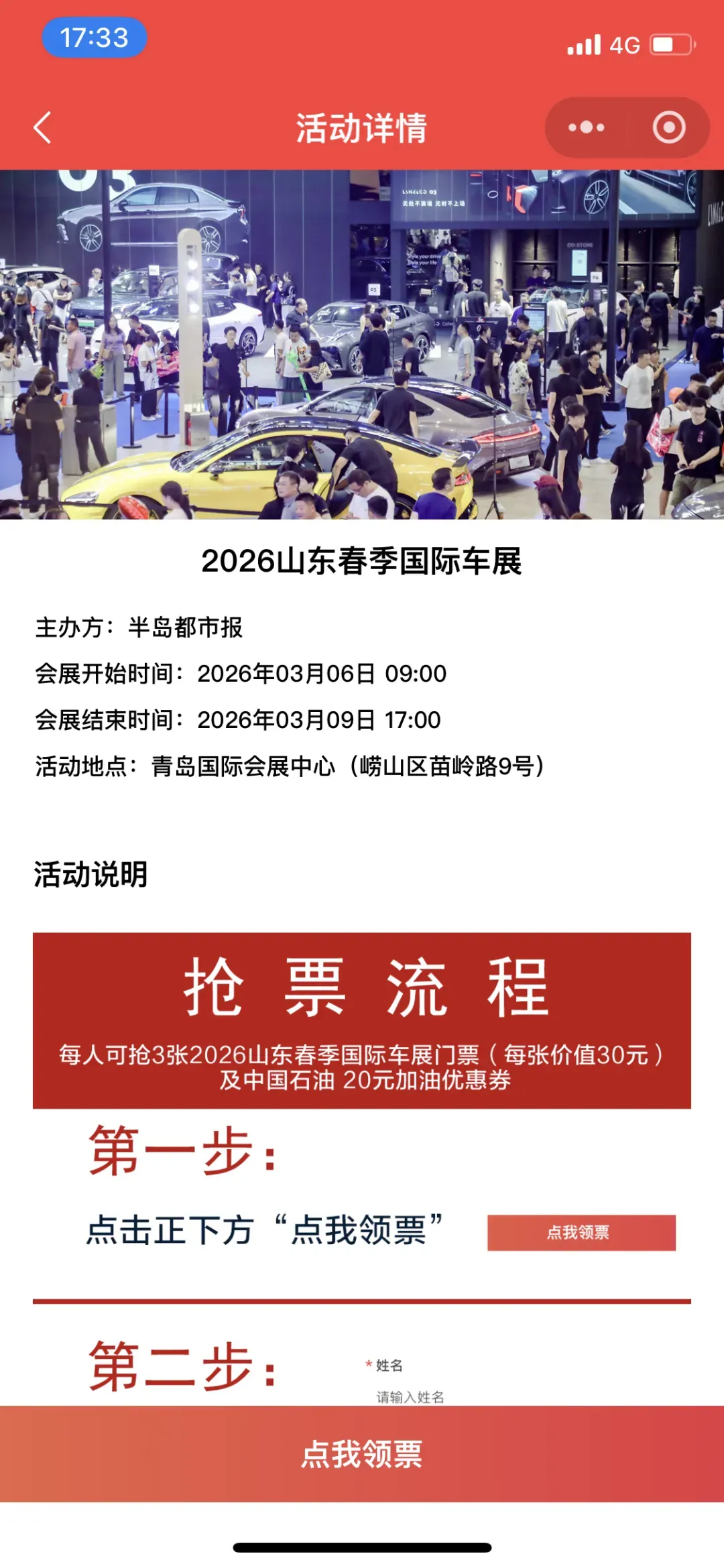 首先,识别或扫描上方的二维码后,就可以直接进入“半岛车展”微信小程序的2026山东春季国际车展免费抢票页面,进行报名。