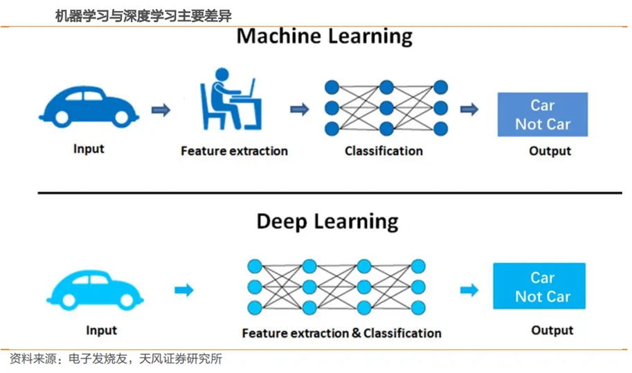 人工智能第一次发展浪潮:推理与搜索占据主导,但由于当时机器计算能力的不足而经历了第一次低迷期。人工智能(Artificial Intelligence,缩写AI),是研究、开发用于模拟、延伸和扩展人的智能的理论、方法、技术及应用系统的一门新的技术科学。这一概念最早由麻省理工学院的约翰·麦卡锡在1956年的达特茅斯会议上提出,随之迎来了人工智能的第一次发展浪潮(1956-1974)。这一时期的核心在于让机器具备逻辑推理能力,通过推理与搜索尝试开发能够解决代数应用题、证明几何定理、使用英语的机器。该阶段的成果几乎无法解决实用问题,另外实际应用中人工智能计算量的增长是惊人的,特别是模拟人类感知带来的巨大运算量远超70年代的计算能力,因此人工智能经历了第一次低迷期。人工智能第二次发展浪潮(1980-1987):专家系统开始商业化,场景局限性限制其发展。这一时期的核心是基于“专家系统”思想,让AI程序能解决特定领域问题,知识库系统和知识工程成为了这一时期的主要研究方向,专家系统能够根据该领域已有的知识或经验进行推理和判断,从而做出可以媲美人类专家的决策。典型代表如医学专家系统MYCIN,MYCIN具有450条规则,其推导患者病情的过程与专家的推导过程类似,开处方的准确率可以达到69%,该水平强于初级医师,但比专业医师(准确率80%)还是差一些。随着人们发现专家系统具有很强的场景局限性,同时面临着升级迭代的高难度和高昂的维护费用,AI技术发展经历了第二次低迷期。从1993年开始,AI技术步入了第三次发展浪潮:深度学习引领浪潮。这一时期,计算性能上的障碍被逐步克服,2006年深度学习这一重要理论被提出,并解决了训练多层神经网络时的过拟合问题。2011年以来,深度学习算法的突破进一步加速了AI技术发展的第三次浪潮,标志性事件是2012年ImageNet图像识别大赛,其深度CNN网络的错误率仅为15%左右,远远好于第二名支持向量机算法的26%,这一结果迅速点燃了产业对神经网络和深度学习的兴趣,深度学习也快速的实现了商业化。2、总结:三次浪潮均始于算法突破,两次寒冬则由于算力和数据量限制第一次浪潮:核心是符号主义(逻辑主义),最重要的成果是逻辑推理、启发式搜索,第一次浪潮中产生的方法主要是基于知识或模型驱动的,建立在“if-then”结构的人工设定的形式逻辑基础;第二次浪潮:专家系统推动人工智能从理论走向实际,BP算法解决非线性分类,成果集中在语音识别、语音翻译等领域;第三次浪潮:深度学习的突破,基于深度学习的神经网络成功用于图像、语音识别。03