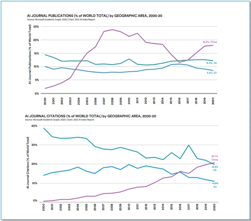 (1)各国纷纷从战略上布局人工智能,加强顶层设计和人才培养当前包括美国、欧洲和中国在内的多个国家,都将大力发展AI产业提升到国家战略层面。2019年2月,美国总统特朗普签署行政命令,正式启动美国人工智能计划,为美国首次推出国家层面的人工智能促进计划。欧盟于2018年发布《欧盟人工智能战略》,并计划在2020年底至少投入200亿欧元。中国方面,以2015年《中国制造2025》出台为开端,人工智能被写入“十三五”规划纲要及政府工作报告。2017年国务院发布《新一代人工智能发展规划》,将人工智能上升到了国家战略层面。随后多部门相继出台若干核心政策和规划,为我国人工智能行业快速发展提供助力。(2)中美领跑,中国人工智能人才数量快速增长,已发展成为人工智能大国近年来,中国人工智能人才数量快速增长,已发展成为人工智能大国。从发表论文和论文被引用的数量可以反映中国人才和技术研究能力与美国和欧洲相比的快速进步。根据斯坦福研究院Human-Centered AI发布的《2021年人工智能指数报告》,在三大人工智能强国(中国、美国和欧盟)中,中国的人工智能论文发表量和被引用量均居全球首位。2020年中国期刊发表数量以18.0%的比例超过美国(12.3%)和欧盟(8.6%)。(3)全球人工智能市场规模快速增长,中国市场增速全球第一全球人工智能产业规模快速增长,软件占比提升。随着数据量的增长及相关复杂性不断增加,传统软件无法处理、分析及提取其中有用的信息,产生人工智能技术需求。根据沙利文的报告,2020年全球人工智能技术支出(包括硬件、软件、服务)为687亿美元,预计2025年达到2212亿美元,年复合增速达到26.3%。其中人工智能软件支出占比将提高,预计2025年全球人工智能软件市场规模将达到1218亿美元,占总支出比例达到55.1%,2020-2025年复合增速达到31.9%。人工智能支出已经成为支持企业数字化转型支出的主力之一。随着数字经济发展,企业积极打造敏捷反应机制,推进精益化管理,提升组织创新能力,大力投资数字化转型相关技术,特别是在人工智能领域。人工智能支出已经成为支持企业数字化转型支出的主力之一。根据IDC数据,全球范围内,企业在包括硬件、软件和服务在内的人工智能(AI)市场的技术投资增速,将显著高于数字化转型(DX)支出和GDP增速。中国是全球人工智能第二大市场,预计增速有望全球第一。根据沙利文的报告,2020年中国人工智能市场规模为295亿元,预计2025年达到1671亿元,年复合增速为41.5%,其中软件市场规模占比将由2020年的9%提升至2025年的24.1%。美国是人工智能核心发源地之一,在技术上拥有全球领先地位,而中国是人工智能应用场景第一强国,中美成为全球人工智能发展的第一梯队。其它国家人工智能发展正在快速跟进,其中欧盟、俄罗斯、德国、日本等发达国家为第二梯队的主力军,不同国家的发展侧重也都稍有不同。人工智能产业包括了基础层、技术层以及应用层,目前我国已形成了较成熟的人工智能生态。在基础层,大数据、云计算、边缘计算、智能芯片领域,国内领先的企业有阿里巴巴、华为、寒武纪等代表企业;在技术层,我国在计算机视觉、智能语音、机器学习、自然语言处理等细分领域也诞生了诸如科大讯飞、云从科技、商汤科技、旷视科技等企业。在应用层,人工智能技术与其他领域结合,应用有智能机器人、智能终端、智能交通、公共安全等。其中机器人领域有新松机器人、科沃斯机器人等代表企业,而众多互联网巨头也纷纷入局智能终端的研发与物联网生态的打造,具有代表性的企业包括了华为、小米、联想、中兴等。06