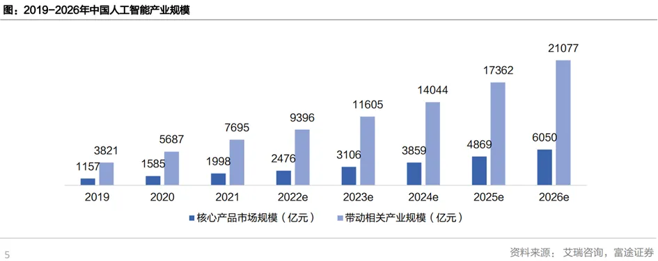 1、中国人工智能行业整体呈快速发展趋势,行业大环境持续向好从2017年以来,中国一直在大力发展人工智能产业,从政策及资本上给予行业很大的支持,人工智能也与5G、大数据、工业互联网等新兴技术产业一起被列入新基建范围。 2020-2022年,是中国人工智能商业化较快的时期,AI进入了深度融合的发展期,开始运用于各行各业。回看近几年AI的发展,行业大环境与快速发展的趋势未改变。自2015年以来,人工智能被先后写进“十三五”、“十四五”国家发展规划纲要。此后,中央部委出台了诸多人工智能工作计划、实施意见。在国家持续推动下,各地也紧跟大潮,充分结合自身优势和产业基础,积极布局人工智能发展规划。例如,2019年,长沙市发布《关于进一步促进人工智能产业发展的意见》提出设立人工智能产业发展专项资金,每年列支5亿元,用于支持全市人工智能产业发展,重点支持产业集聚、企业引培、研发创新、示范应用、人才培养、金融创新、生态优化等方面。2022年,广州市发布《关于开展2022年度新一代信息技术、人工智能政策兑现工作的通知》提出针对人工智能示范应用、获奖情况进行资金奖励,并对相关企业租房用房、举办重大活动提供资金支持。3、技术:应用驱动创新、积极补齐短板,已基本形成创新高地目前中国各类AI技术全面发展,除了由市场需求驱动的应用技术发展之外,在政策牵引及业务需求驱动下,中国市场也在积极补齐基础理论研究方面的短板,大力推动如AI芯片、深度学习等领域的技术突破,从底层技术出发赋能AI产品及解决方案的迭代。从技术创新角度看,以中国为首的东亚地区,已基本形成了人工智能创新高地,中国在专利、论文量及全球占比也在逐年提升。4、产业融合:AI持续泛化,持续深入赋能传统行业并保持健康发展态势当前,人工智能已广泛应用于人们日常生产、生活的方方面面,人工智能工具的引入也为中国数字经济发展带来巨大的增量,其发展态势健康稳定、持续且乐观。同时,在产业智能化转型升级的进程中,传统行业的参与程度将越来越深入,这将为AI提供海量的数据和更丰富的应用场景,为人工智能的应用打开新的空间。随着人工智能产业的不断发展和投资,人工智能产业规模在过去五年持续增长。根据2017年国务院发布的《新一代人工智能发展规划》,到2020年人工智能与世界先进水平同步,核心产业规模超过1500亿元,带动相关产业规模超过1万亿元;到2025年,核心产业规模将超过4000亿元,带动相关产业规模超过5万亿元。2021年人工智能核心产业规模预计达到1998亿元规模,预计将于2026年超过6000亿元,对应2021年到2026年的CAGR为24.8%,带动产业规模超过2万亿元。随着越来越多的头部企业登陆资本市场,市场份额将进一步集中。09