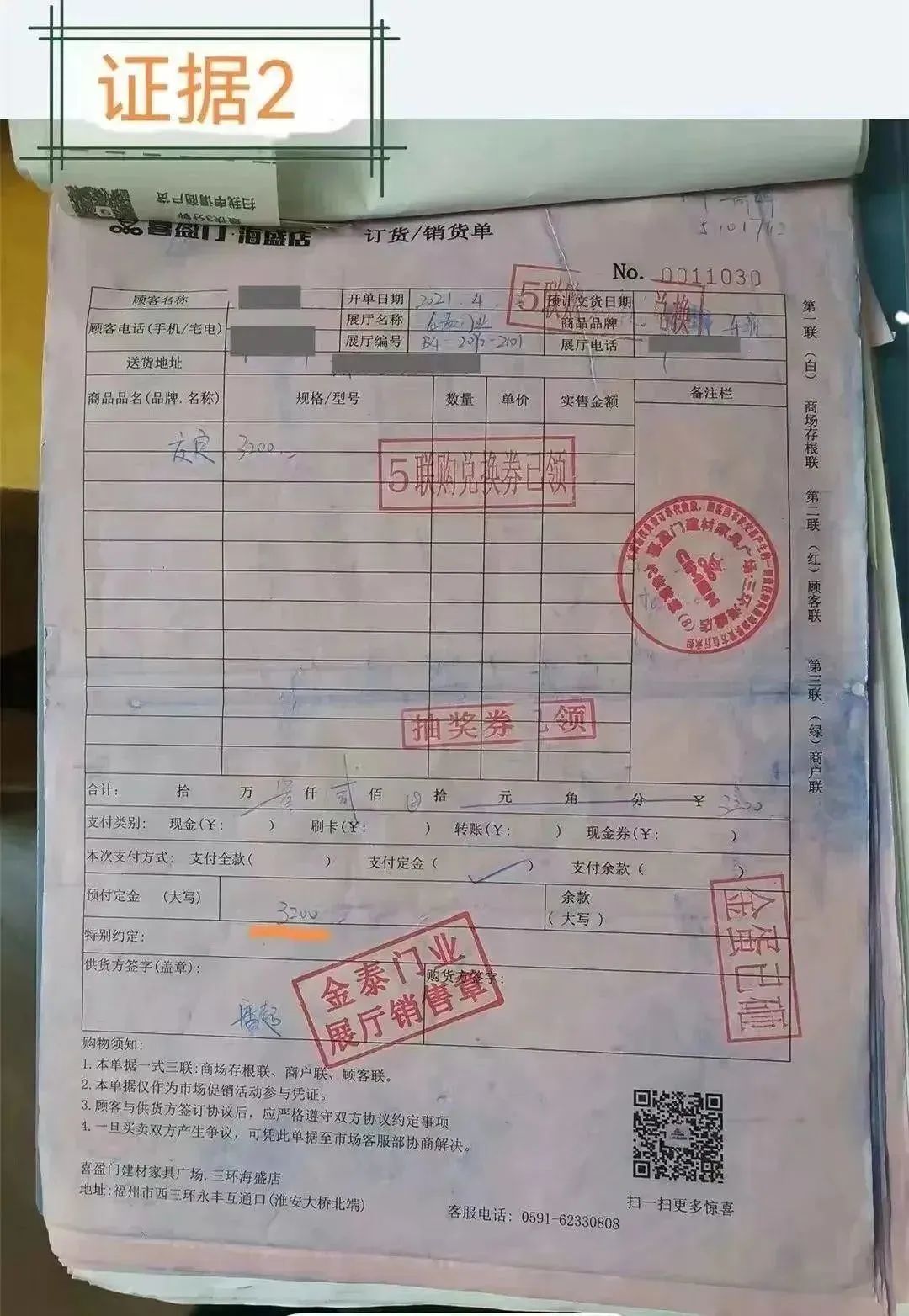 近日,福建省福州市消费者权益保护委员会接消费者杨先生投诉称,2021年4月12日,他在海峡国际家居建材城(原喜盈门建材家具广场三环海盛店)举办展销会期间,与参加展销的“金泰门业”签订木门、合金门定制合同。▲出具的定金收据