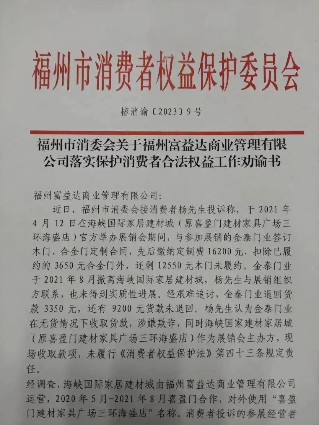 先后缴纳定制费16200元(含定金),扣除已履约的3650元合金门外,还剩12550元木门未履约,经艰难追讨,“金泰门业”退回货款3350元,还有9200元货款未退回。2021年8月,“金泰门业”撤离展销会。之后,杨先生与海峡国际家居建材城商讨退款事宜,但未得到实质性进展。杨先生认为“金泰门业”在无货情况下收取货款,涉嫌欺诈,海峡国家建材家居城作为展销会主办方,且现场收取部分货款,应履行相关赔偿责任。经调查,海峡国际家居建材城由福州富益达商业管理有限公司运营,在2020年5月-2021年8月期间与喜盈门合作,对外使用“喜盈门建材家具广场三环海盛店”名称。