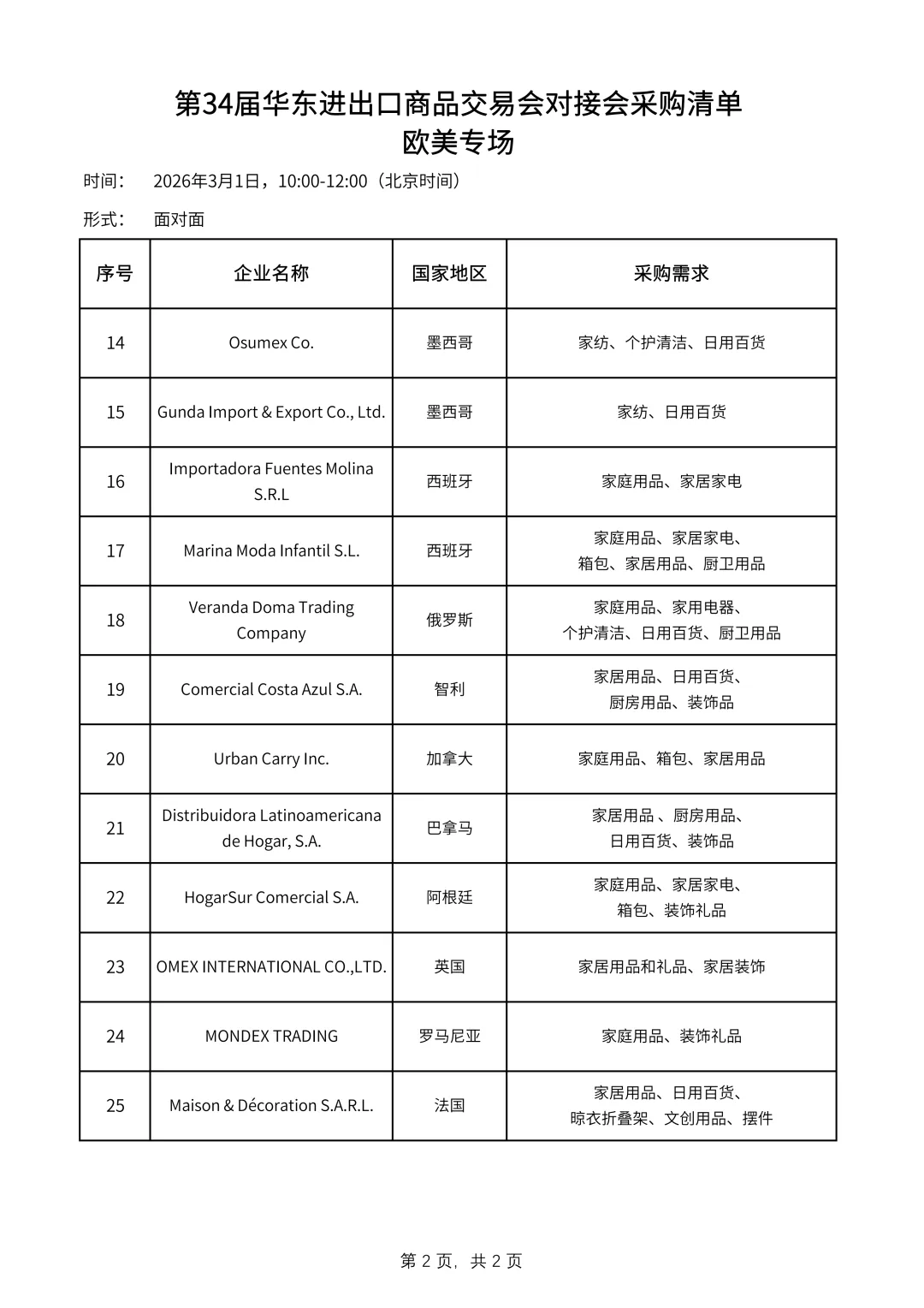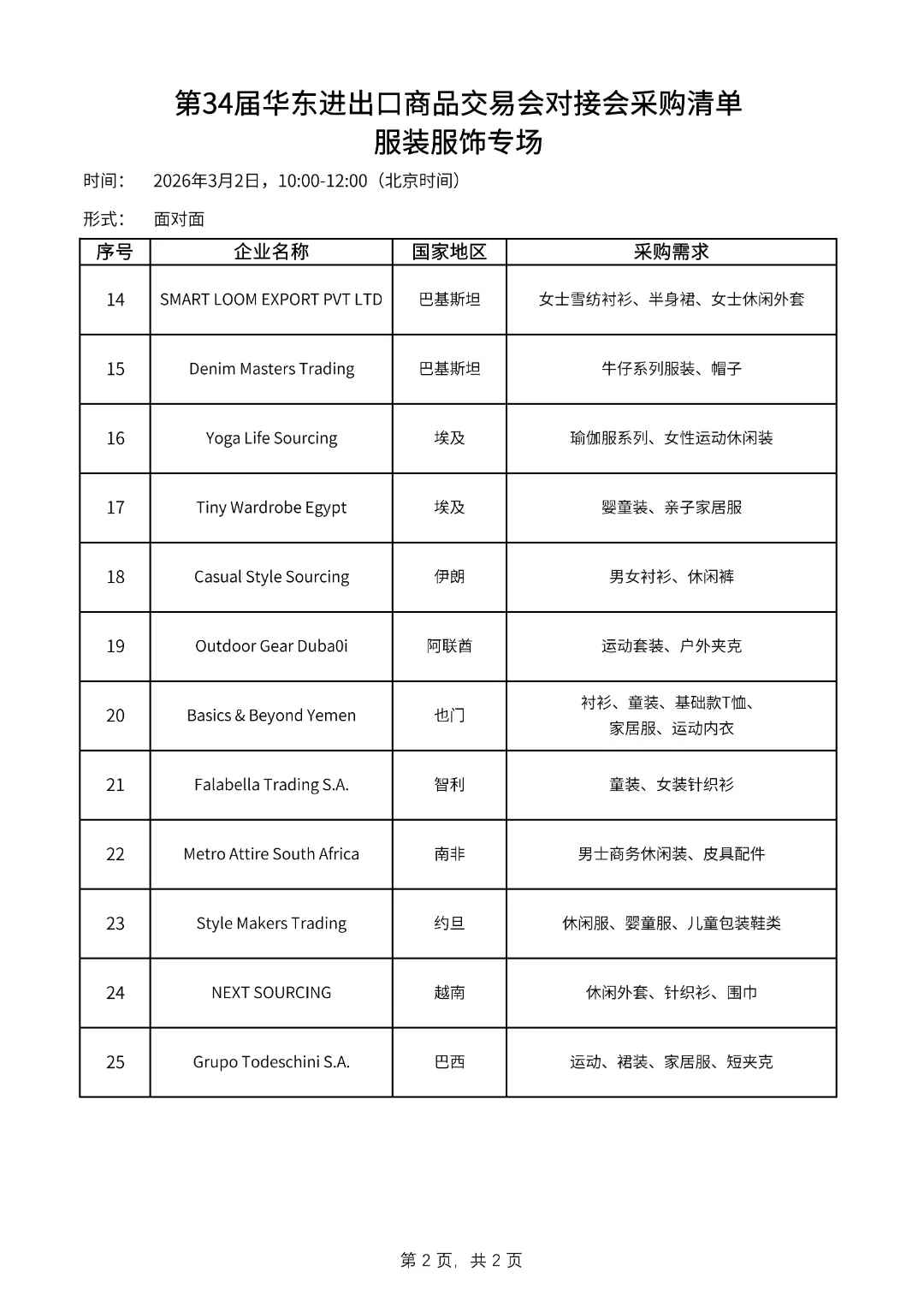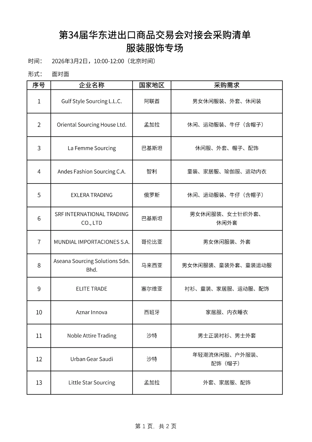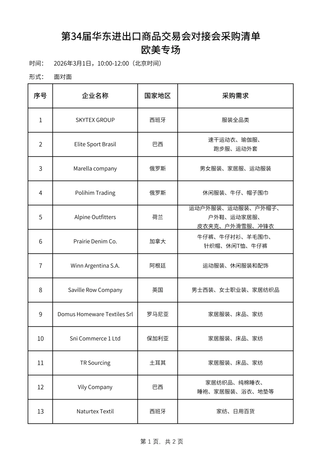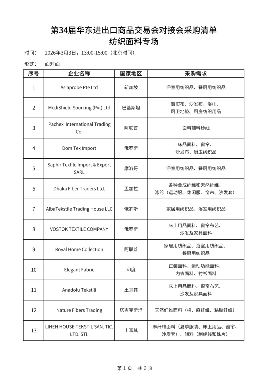 第34届华东进出口商品交易会将于2026年3月1日至3月4日在上海新国际博览中心举办,设4个专业子展和2个专业展区:服装服饰展、纺织面料展、家庭用品展、装饰礼品展、境外展区和跨境电商展区,总规模为11.5万平方米。