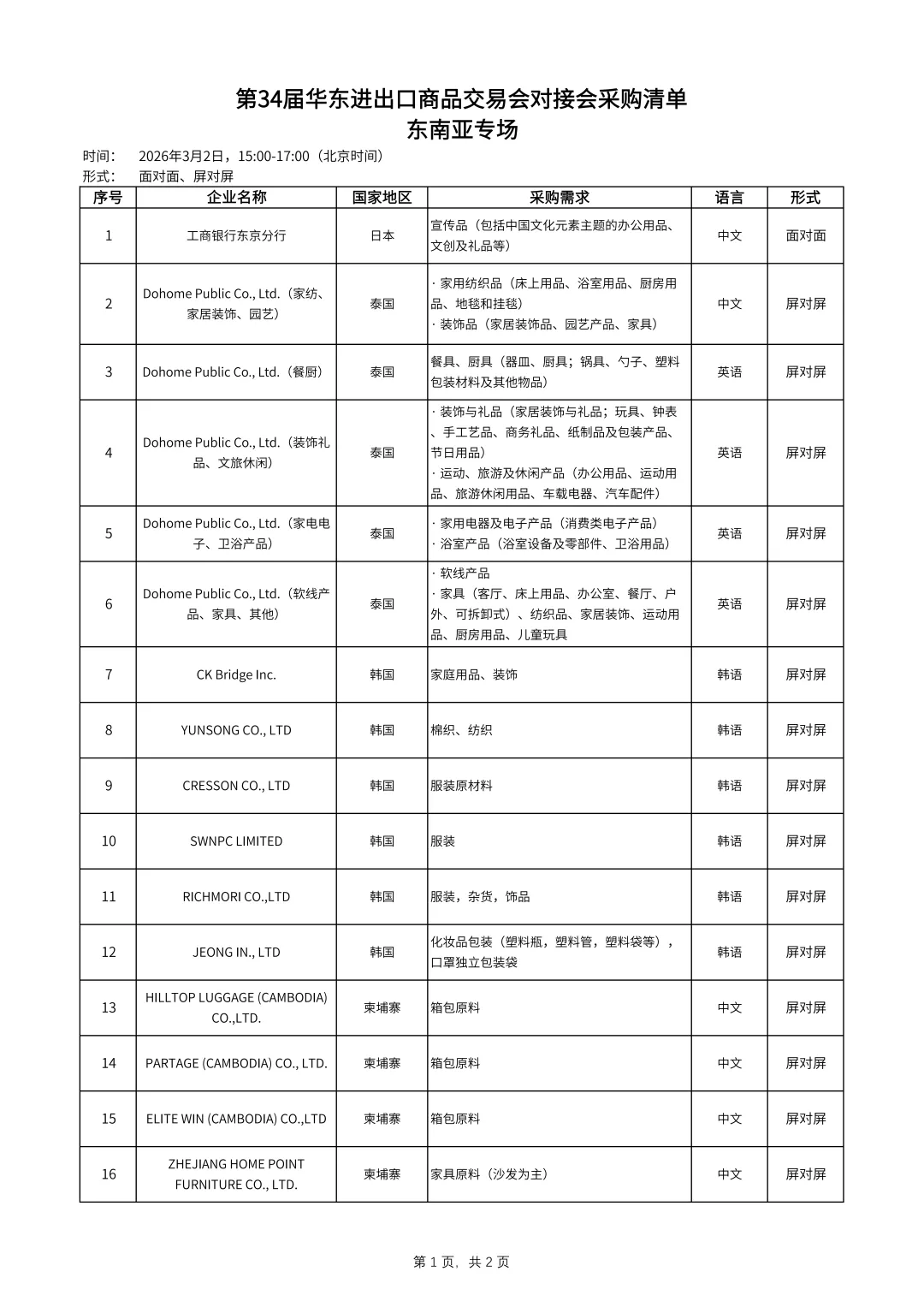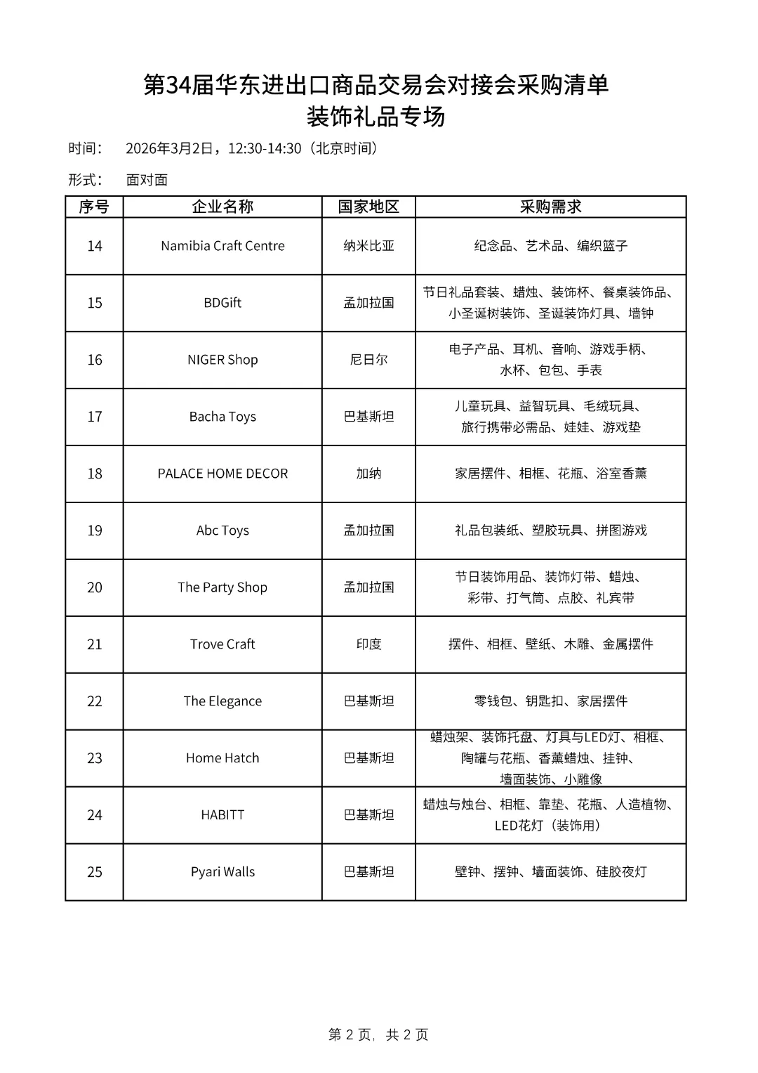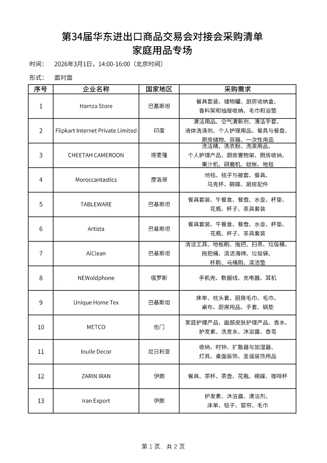 面向参展企业,第34届华交会专门开展“一对一”“面对面”对接会7场(家庭用品专场、服装服饰专场、装饰礼品专场、纺织面料专场、欧美专场、东南亚专场、日韩专场),以更好地服务、提高参展企业的成交效率。