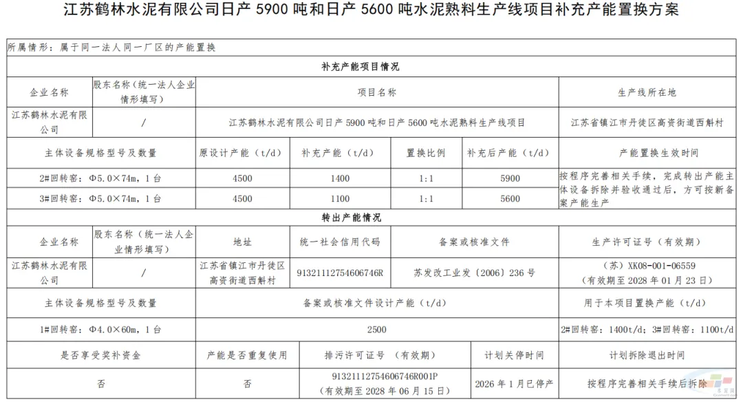 江苏鹤林水泥有限公司拟拆除该公司1#回转窑2500t/d生产线,将其中1400t/d水泥熟料产能补充到2#回转窑4500t/d生产线,剩余1100t/d水泥熟料产能补充到3#回转窑4500t/d生产线。