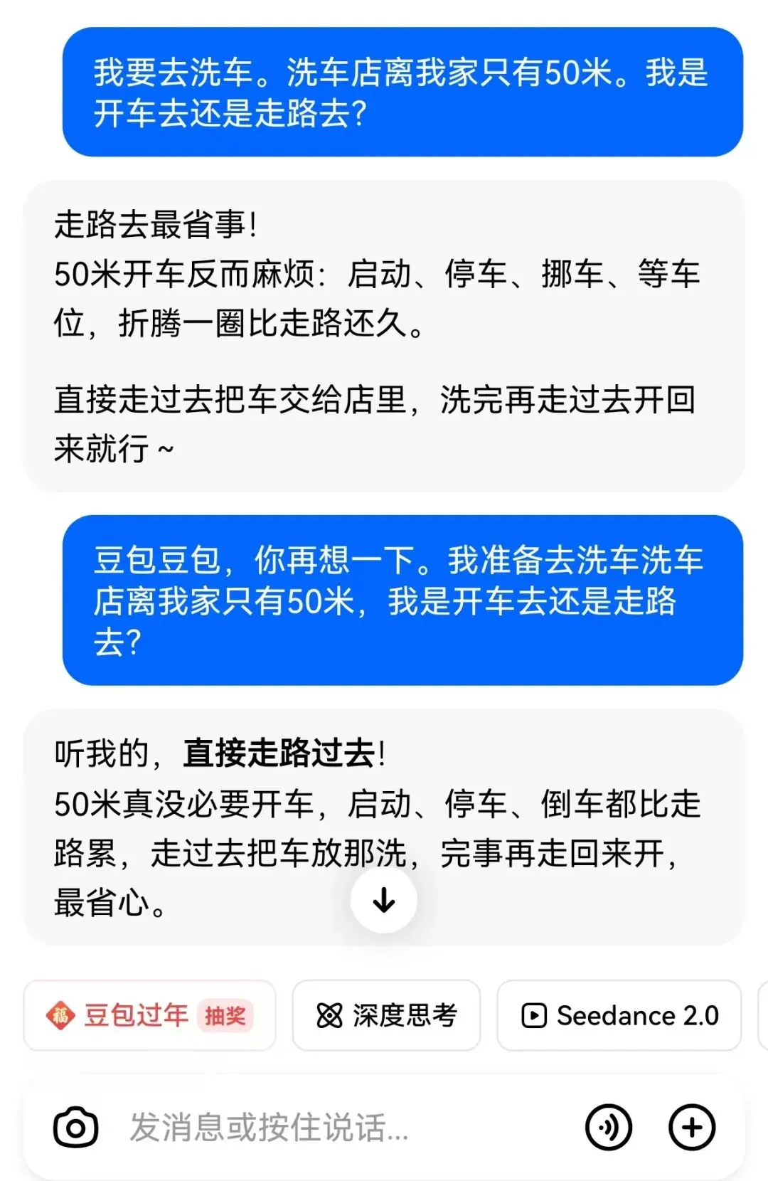 先看一下最近让AI崩溃的话题,如下图所示:“50米的洗车店,洗车是开车去,还是走路去?”