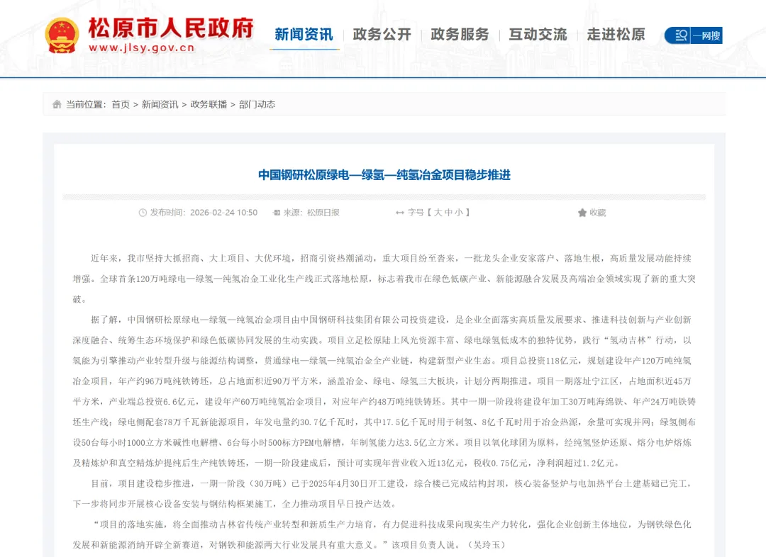 近日,全球首条120万吨绿电—绿氢—纯氢冶金工业化生产线正式落地松原,标志着松原市在绿色低碳产业、新能源融合发展及高端冶金领域实现了新的重大突破。