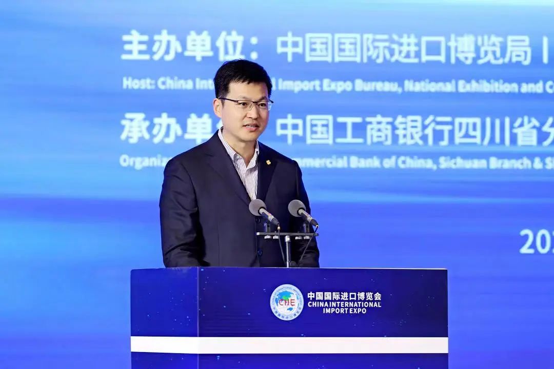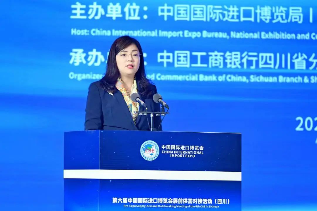 4月20日下午,第六届进博会展前供需对接活动(四川)在成都成功举办。本次活动由中国国际进口博览局、国家会展中心(上海)、四川省商务厅、中国工商银行主办,中国工商银行四川省分行、上海市分行和四川省商务发展事务中心承办。国家会展中心(上海)总裁助理宋尚哲,商务部驻成都特派员付艳,四川省商务厅副厅长陈友清,中国工商银行总行国际业务部副总经理张悦、四川省分行副行长周玥,成都市跨境电子商务协会秘书长姚正毅等出席活动并致辞。