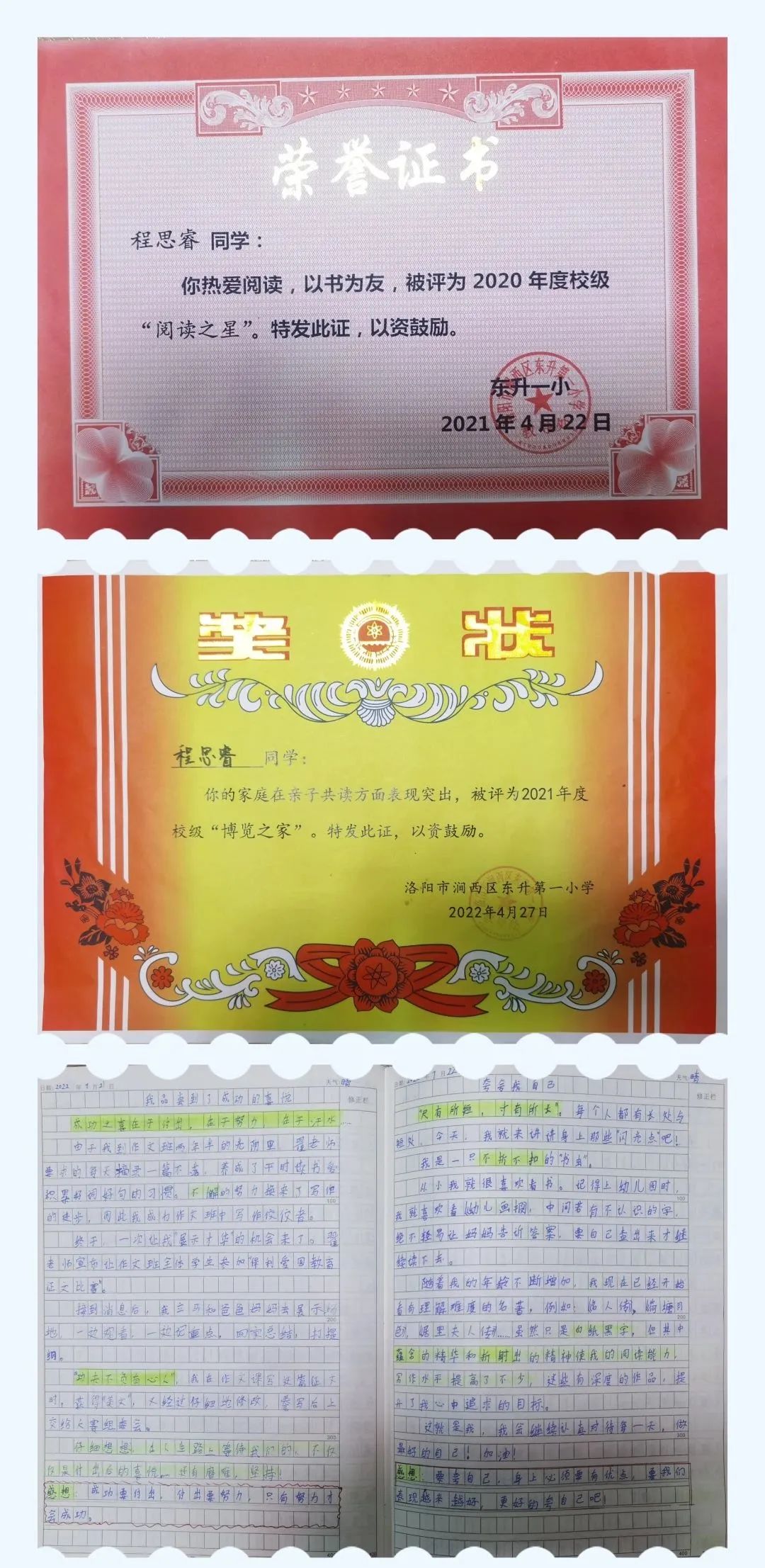 书籍是人类进步的阶梯。自从程思睿同学爱上阅读后,他还养成了边读书边摘抄的好习惯。在2020年度“你热爱阅读,以书为友”活动中被评为校级“阅读之星”,2021年度被评为校级“博览之家”。