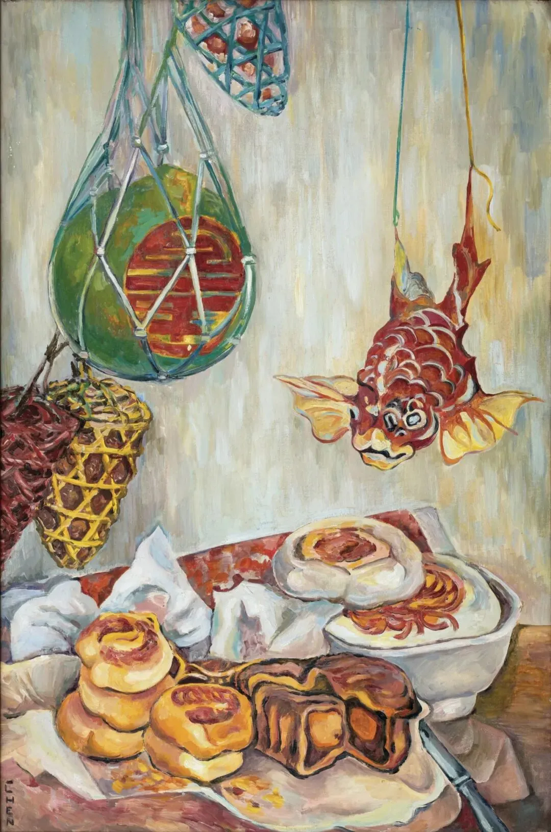 张荔英 (新加坡籍华裔,1906/7-1993)《静物(中秋节)》,约1960年代中旬布面油彩81×54 厘米