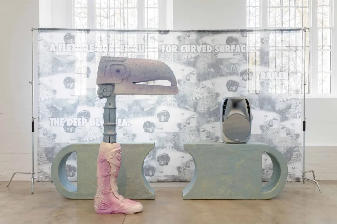 关小(中国,1983年出生)《亚马逊黄金》,2016年玻璃钢 树脂 丙烯着色 原子灰 音箱 C型架 网眼布打印背景板:250×450 厘米靴子:100×190×26 厘米音箱:44×44×70 厘米板材:150×80×30 厘米