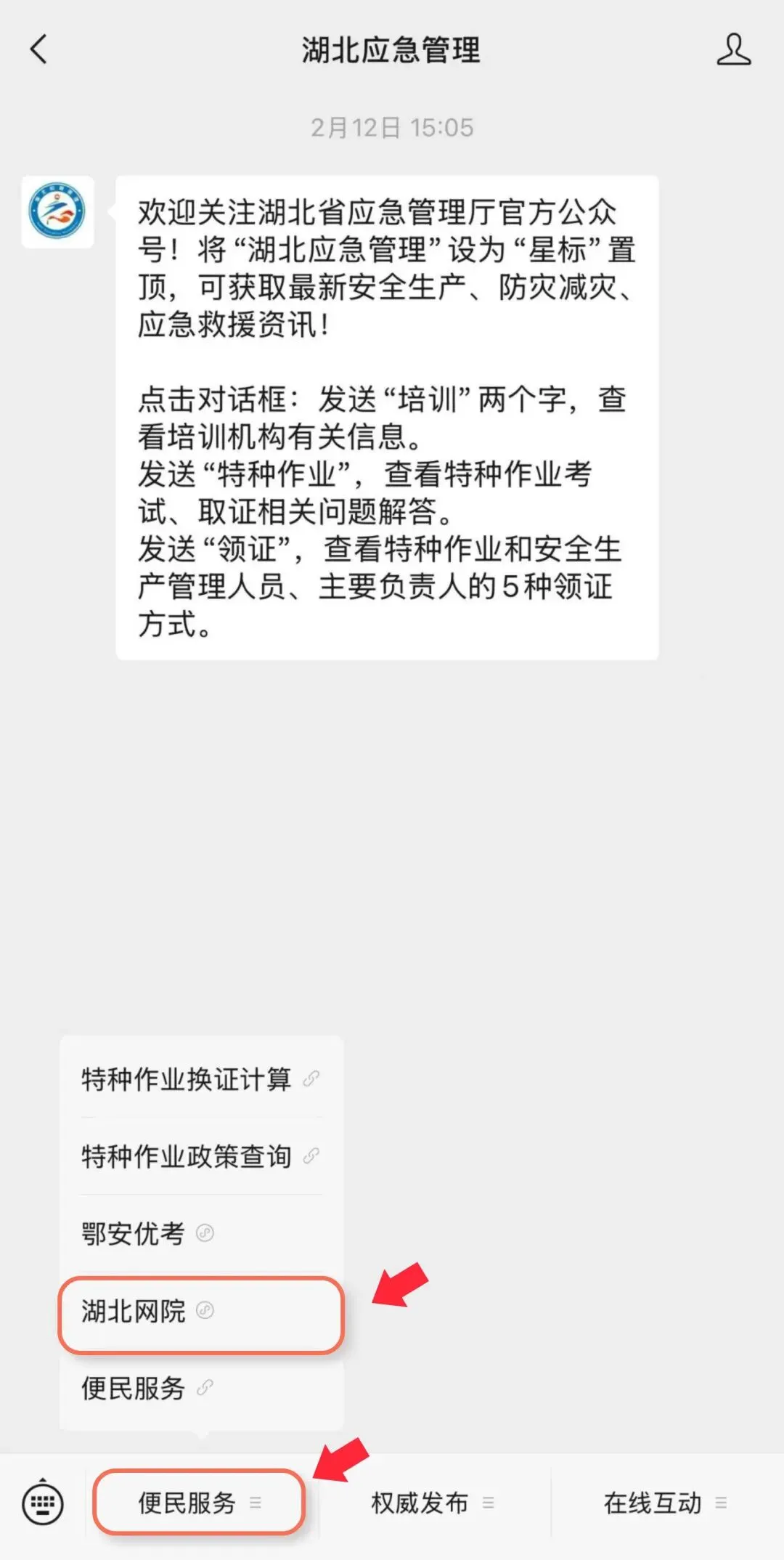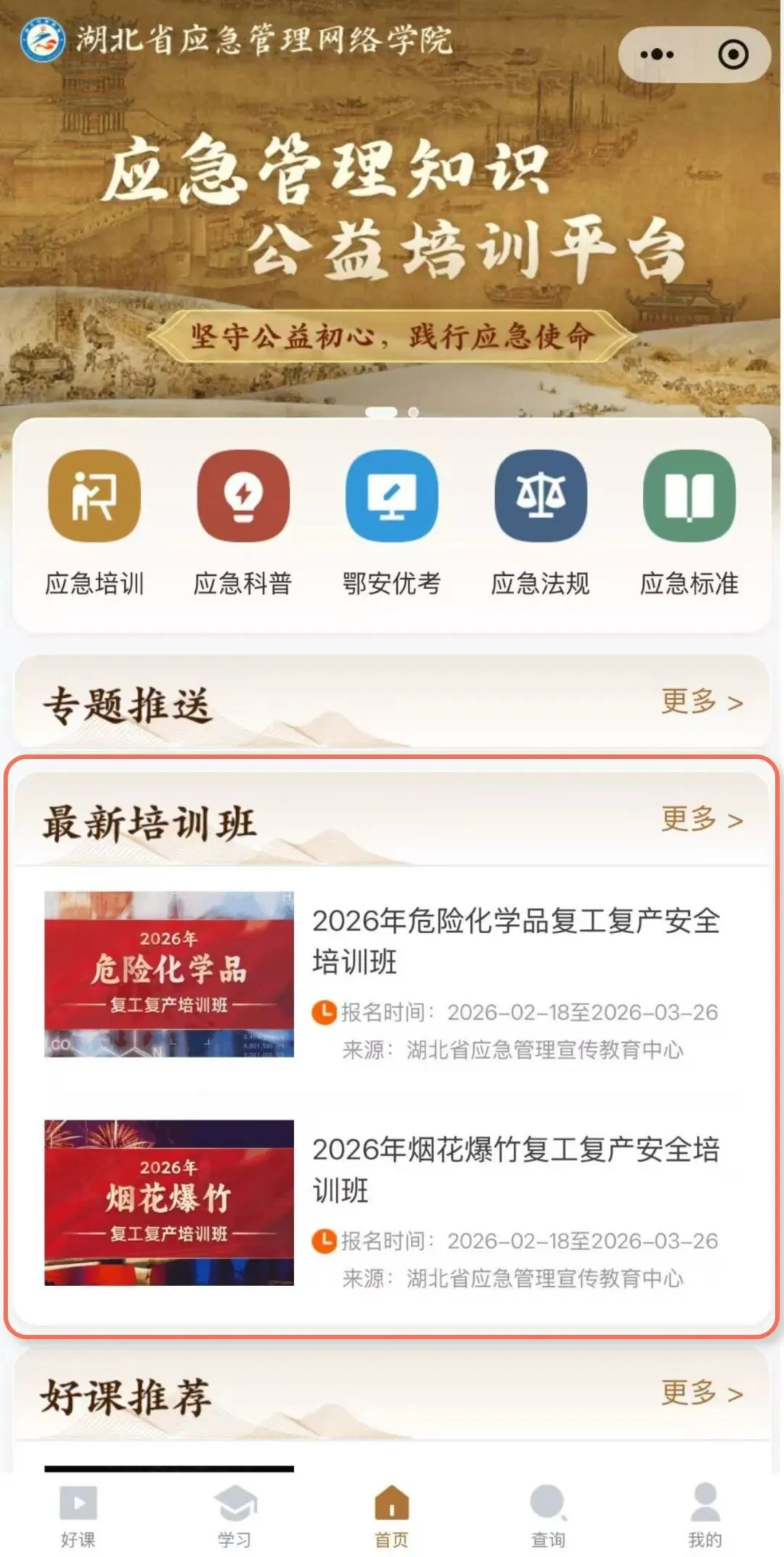 方式一:关注“湖北应急管理”微信公众号,点击私信→便民服务→湖北网院。点击“最新培训班”下的【2026年XX行业复工复产安全培训班】专题页面。根据页面提示完成注册或登录,再次点击该培训班进行报名,填写资料提交后即可进入学习。