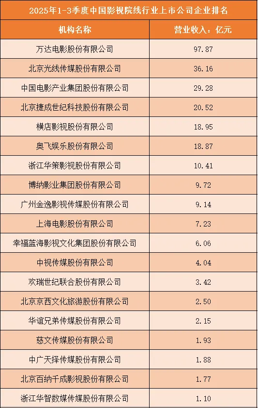 一、2025年1-3季度中国影视院线行业上市公司企业排名分析