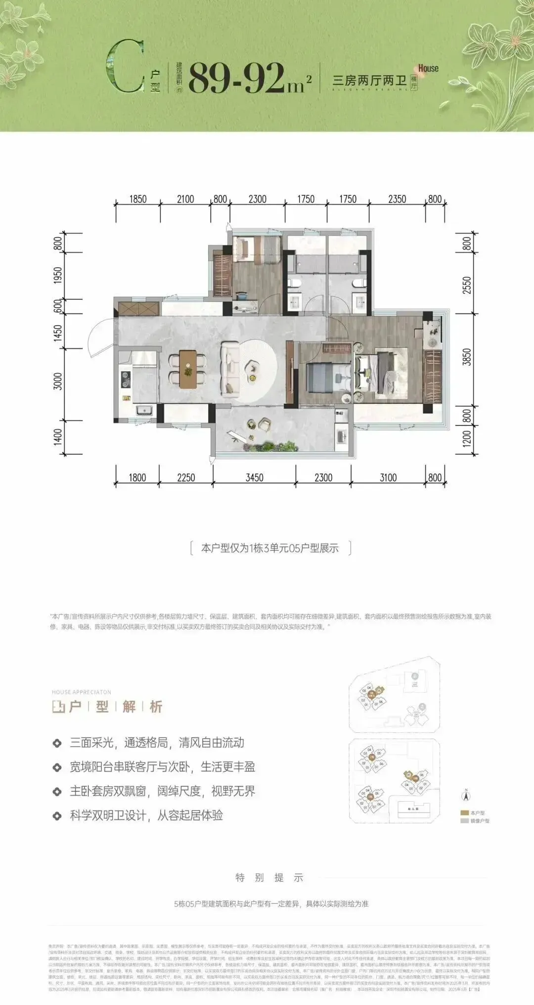 招商会展湾雍境名邸位于宝安沙井大前海会展湾片区的招商会展湾雍境名邸于2025年4月30日取证入市,本次是招商会展湾雍境二期,首推1栋3单元的195套房源,面积段有80㎡3房1卫,91㎡3房2卫,92㎡3房2卫3种户型,是3梯7户的普通高层,预计2027年9月精装交楼。