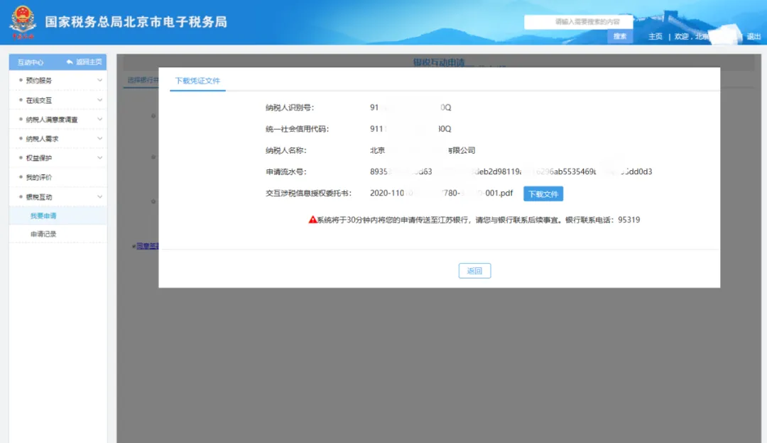 6.点击“确认”按钮后,界面显示当前纳税人申请的状态及银行的相关信息,纳税人可以在本界面下载上一步签署的“授权委托书”,至此,纳税人在税局的操作结束,后续银行所需手续页面附有联系方式,可咨询相应的银行。