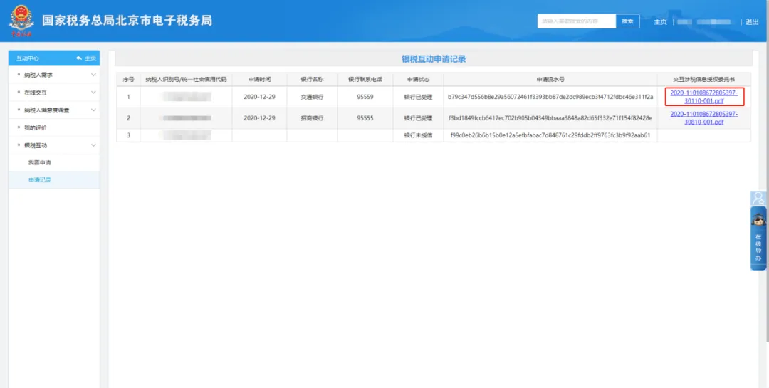 在左侧栏目中找到 “申请记录”并点击可以查询申请记录,点击右侧PDF文件,可下载查看“交互涉税信息授权委托书”。