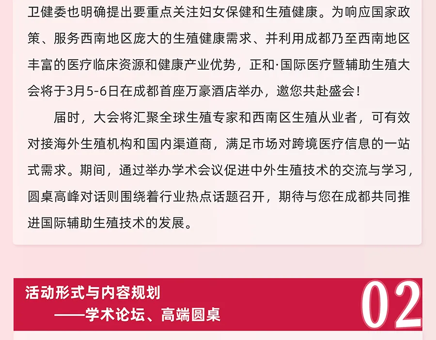 由正和会展集团主办的2026CMTF国际辅助生殖大会将于3月5-6日在成都首座万豪酒店隆重召开。此次盛会旨在搭建一个高规格、国际化的国际辅助生殖行业交流平台,汇聚全球知名的生殖医学专家、学者和行业领袖,共同探讨生殖领域的最新研究成果和前沿技术,分享合作机遇和行业未来发展趋势,同时给各类不孕家庭带来好孕希望,邀您共赴盛会,共绘辅助生殖医学新篇章!