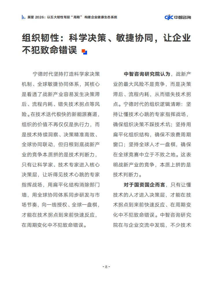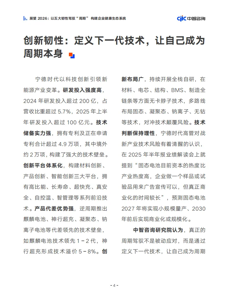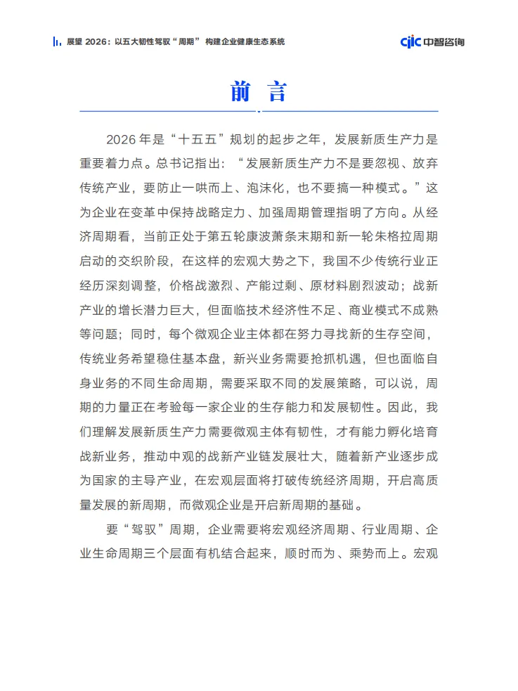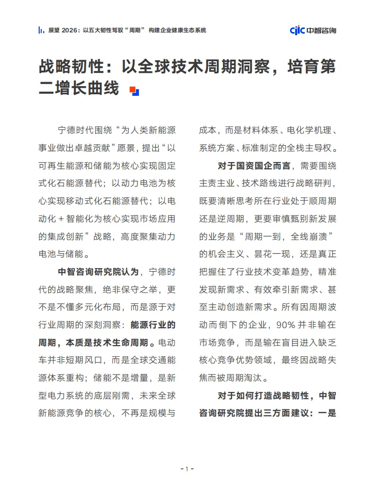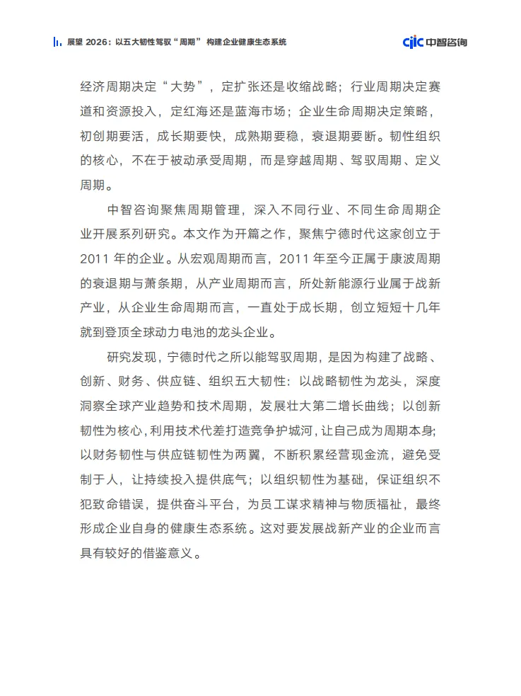 2026年作为“十五五”规划起步之年,企业发展需立足宏观周期特征,以韧性构建健康生态系统,中智咨询这份报告以宁德时代为研究案例,提出企业需打造战略、创新、组织、供应链、财务五大韧性,以此驾驭经济、行业、企业自身的三重周期,实现穿越周期的发展。