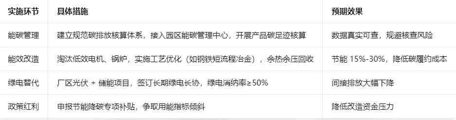 政府补贴:积极申报国家、省级节能降碳专项补贴。 市场融资:利用绿色信贷、绿色债券、碳交易收益等多元化融资渠道。 园区统筹:建立园区节能降碳基金,支持中小企业改造。