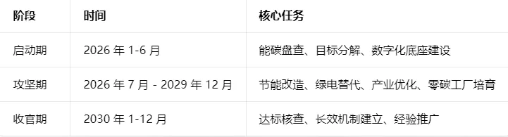 :覆盖园区 Scope1+2 + 关键 Scope3 排放,建立企业能碳台账,锁定近 3 年基准数据,识别高耗环节与减排潜力。 - 目标分解与路径设计