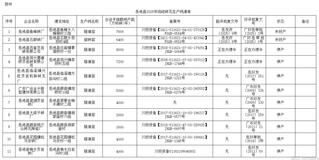 为持续抓好我县烧结砖瓦企业产能管理工作,促进行业健康高质量发展,根据《广安市经济和信息化局关于报送水泥玻璃砖瓦行业生产线清单的通知》文件有关要求,现将岳池县2025年烧结砖瓦生产线清单予以公告。