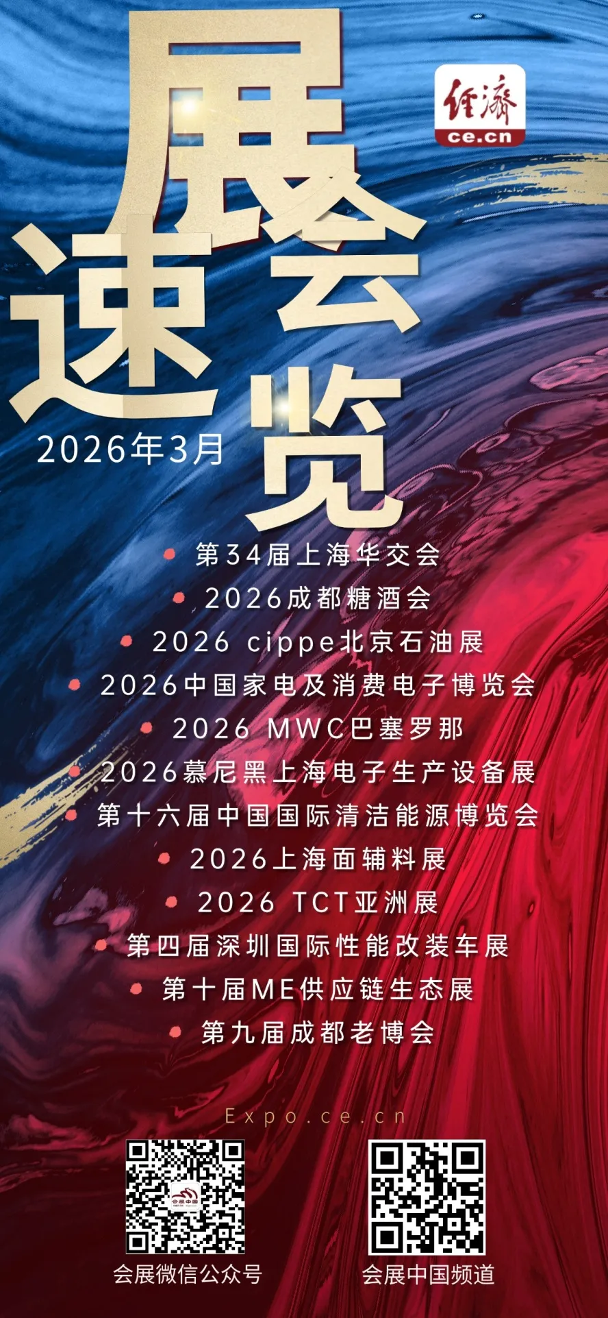 3月会展市场春意盎然,万象更新,行业会展迎来集中启动期。全国多地展馆排期紧凑,产业交流、商贸对接与前沿探索并进,为经济活力持续释放注入会展动能,开启新一年度的专业盛会季。3月将举办哪些重要展会?中国经济网带你“展”望!第34届华东进出口商品交易会(上海华交会)总面积预计13万平方米,是由9省市商务部门联合主办的区域性国际经贸展会,自1991年创办以来通常每年3月在上海举办。地点:成都中国西部国际博览城/世纪城新国际会展中心第114届全国糖酒会展览(2026成都糖酒会)继续采用“一城双馆”模式,在成都世纪城和西博城举办,总面积32.5万平方米,西博城聚焦“好吃”,世纪城聚焦“好喝”,双馆呼应全国糖酒会主题。同时将推出为期一个月的展城融合促消费活动——2026“春糖季”,预计将有超过6600家全球食品、酒饮及上下游企业参展。2026 CIPPE中国国际石油石化技术装备展览会(cippe北京石油展)以“智链能创·绿动未来”为核心主题,规划展示面积达12万平方米,预计吸引来自81个国家和地区的2000余家企业参展。地点:上海新国际博览中心\上海东方枢纽国际商务合作区展区中国家电及消费电子博览会(AWE)自2011年在上海首次规模化举办以来,已成为全球家电与消费电子领域的重要展示平台。2026年AWE,将迎来一项重要的模式创新,首次采用“一展双区”的形式进行,分别在上海新国际博览中心和上海东方枢纽国际商务合作区展区同步举行。本届展会的主题定为“AI科技、慧享未来”,旨在通过两地联展的形式,更立体地呈现人工智能技术与日常家居生活融合的最新成果。作为全球最具影响力的移动通信展会,2026年世界移动通信大会(MWC巴塞罗那)预计将吸引超过2000家参展商。本届大会以 “The IQ Era(智能纪元)” 为主题,聚焦未来智能连接,展示最前沿的技术与解决方案。作为电子制造行业重要的展示与交流平台,2026慕尼黑上海电子生产设备展以近10万平方米展示面积、超1000家参展企业的规模,聚焦汽车、工业、通讯电子、医疗电子等多领域需求,旨在为行业呈现一场覆盖电子生产全产业链的“创新盛宴”,重点聚焦智慧工厂、新能源汽车技术及数字化未来。第十六届中国国际清洁能源博览会(CEEC 2026)以“智联光储氢,绿链新未来”为主题,下设第二届中国国际光伏创新应用展览会(中国光伏创新展)、第四届中国储能大会暨展览会、第五届中国国际氢能及燃料电池产业展览会(CIHC 中国氢能展)、2026中国新能源人工智能应用展览会(中国新能源AI展)四大专业展。会期将举办多场主题大会及配套活动,包括企业新品发布、国际交流、合作签约、项目对接、媒体专访、科普研学等。中国国际纺织面料及辅料博览会(intertextile上海面辅料展)创办于1995年,是业界极具影响力的展会之一。展会为业界人士提供优质的家用纺织及辅料采购平台,同时还将举行多项展会同期活动。亚太地区颇具影响力的3D打印展会,TCT Asia 2026(TCT亚洲展)以“汇聚亚太制造力·链接全球新格局”为主题,规模突破5.5万平方米,汇聚超500家全球领先的增材制造展商,旨在构建从技术研发到商业实战的全球链接路径。第四届深圳国际性能及定制改装汽车博览会(深圳国际性能改装车展)与2026 深圳国际智慧出行、汽车改装及汽车服务业生态博览会(九州汽车生态博览会) 同期举办。本届博览会总展出规模将达60万平方米,汇聚7000家汽车产业链品牌及40万专业观众,集中展示多款定制版、运动版、共创版车型,并汇聚国内外知名改装品牌的最新成果与前沿行业资讯。第十届中国医疗器械供应链生态大会暨展览会(ME供应链生态展)旨在全面展示医疗器械产业,从源头创新到产品上市的全链条核心要素,推动高端制造装备赋能供应链升级,助力我国高端医疗装备加快实现自主可控。第九届中国成都国际养老服务业博览会(成都老博会)规划6万平方米展区,聚焦“银发未来,全龄现场”,引导创新科技与养老服务、适老化产品、银发经济、数字医养的融合发展,特设AI机器人馆及国际银发展团。中国经济网综合整理。转载请注明来源:中经网会展,侵权必究。