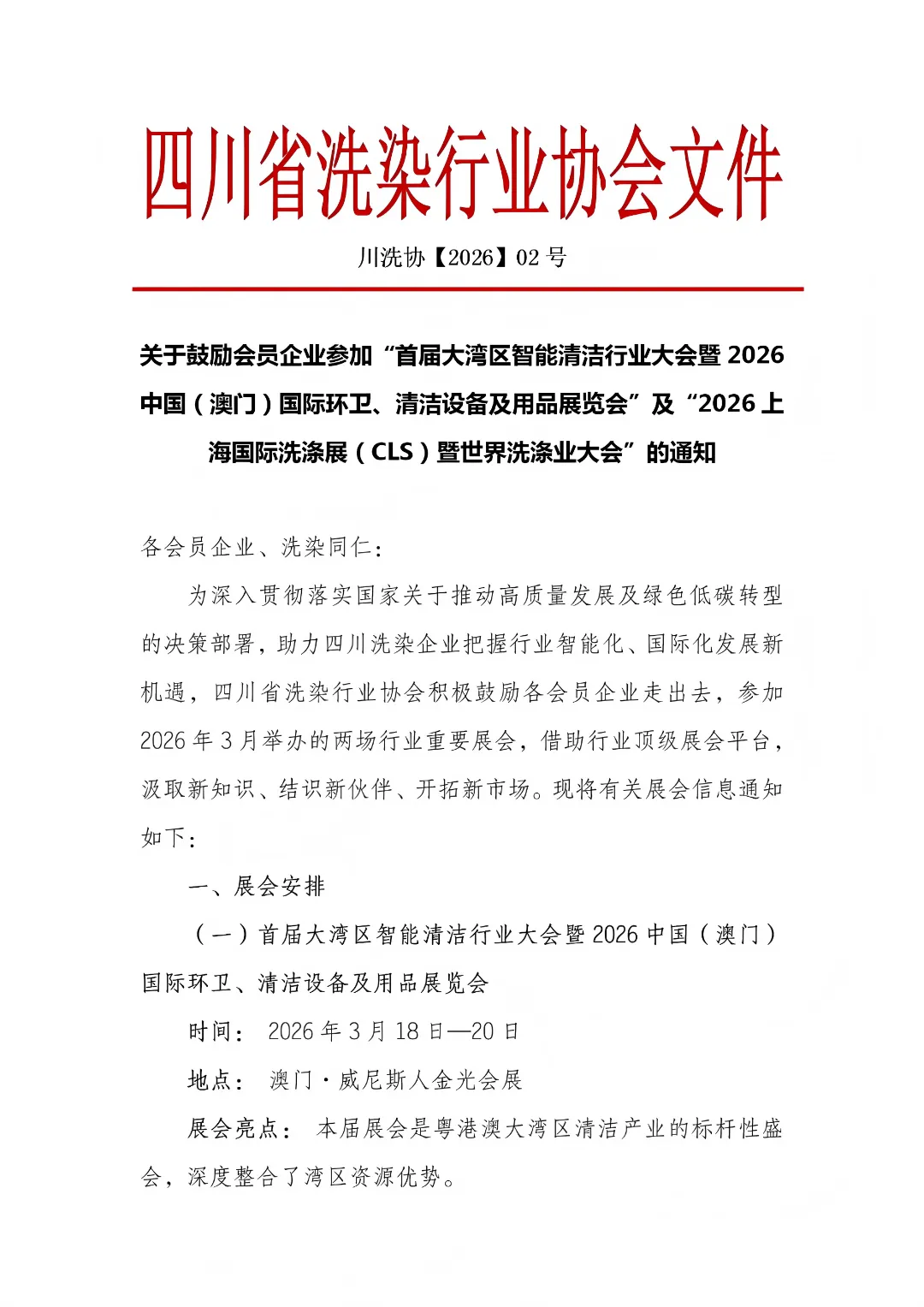 为深入贯彻落实国家关于推动高质量发展及绿色低碳转型的决策部署,助力四川洗染企业把握行业智能化、国际化发展新机遇,四川省洗染行业协会积极鼓励各会员企业走出去,参加2026年3月举办的两场行业重要展会,借助行业顶级展会平台,汲取新知识、结识新伙伴、开拓新市场。现将有关展会信息通知如下: