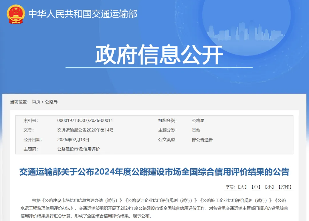 交通运输部关于公布2024年度公路建设市场全国综合信用评价结果的公告