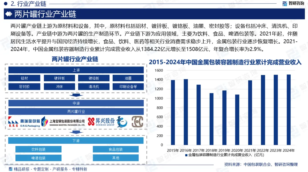 产业链核心节点:两片罐产业链上游为原材料和设备,其中,原材料包括铝材、镀锌板、镀铬板、油墨、密封胶等;设备包括冲床、清洗机、印刷设备等。产业链中游为两片罐的生产制造环节。产业链下游为应用领域,主要为饮料、食品、啤酒包装等。