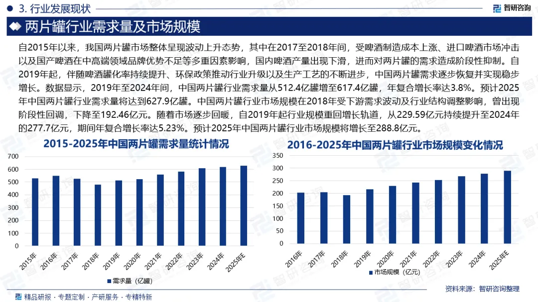 两片罐是金属罐的一种,于20世纪中叶问世,由罐身和罐盖两部分构成。其罐身采用金属薄板通过冲床拉伸成型工艺一次加工而成,实现罐底与罐身一体化结构,减少传统三片罐的接缝环节。按材质分为铝罐和铁罐,其中铝罐因轻量化优势占据主流;按照罐身的高矮分为浅冲罐和深冲罐;按制造技术分为变薄拉伸罐和深冲拉拔罐。相较三片罐,两片罐具有密封性强、生产效率高及材料消耗少等特点,但对材料性能和生产设备要求较高,广泛应用于碳酸饮料、啤酒等产气饮品包装。自2015年以来,我国两片罐市场整体呈现波动上升态势,其中在2017至2018年间,受啤酒制造成本上涨、进口啤酒市场冲击以及国产啤酒在中高端领域品牌优势不足等多重因素影响,国内啤酒产量出现下滑,进而对两片罐的需求造成阶段性抑制。自2019年起,伴随啤酒罐化率持续提升、环保政策推动行业升级以及生产工艺的不断进步,中国两片罐需求逐步恢复并实现稳步增长。数据显示,2019年至2024年间,中国两片罐行业需求量从512.4亿罐增至617.4亿罐,年复合增长率达3.8%。展望未来,在啤酒罐化率进一步攀升以及碳酸饮料市场持续扩容的共同推动下,我国两片罐市场需求有望持续释放,需求量将保持逐年增长态势,预计2025年中国两片罐行业需求量将达到627.9亿罐。中国两片罐行业市场规模在2018年受下游需求波动及行业结构调整影响,曾出现阶段性回调,下降至192.46亿元。随着市场逐步回暖,自2019年起行业规模重回增长轨道,从229.59亿元持续提升至2024年的277.7亿元,期间年复合增长率达5.23%。这一增长主要得益于国内消费升级背景下饮料品类结构优化、啤酒罐化进程加速带来的需求拉动,以及环保政策引导下金属包装替代效应的逐步显现。在产业升级与市场需求双重驱动下,行业未来仍具有持续发展动力,预计2025年中国两片罐行业市场规模将增长至288.8亿元。2008年以前,我国两片罐市场主要由外资企业主导,随后随着波尔、太平洋等外资企业逐步退出中国市场,以奥瑞金、宝钢包装为代表的本土企业迅速崛起并占据市场主导地位。自2016年起,在行业并购整合加速与市场竞争加剧的双重推动下,部分竞争优势较弱的中小企业陆续退出,进一步提升了行业集中度。目前,我国两片罐代表企业主要包括宝钢包装、奥瑞金、昇兴股份、嘉美股份、华东制罐、北海金盟制罐、上海制罐等。
