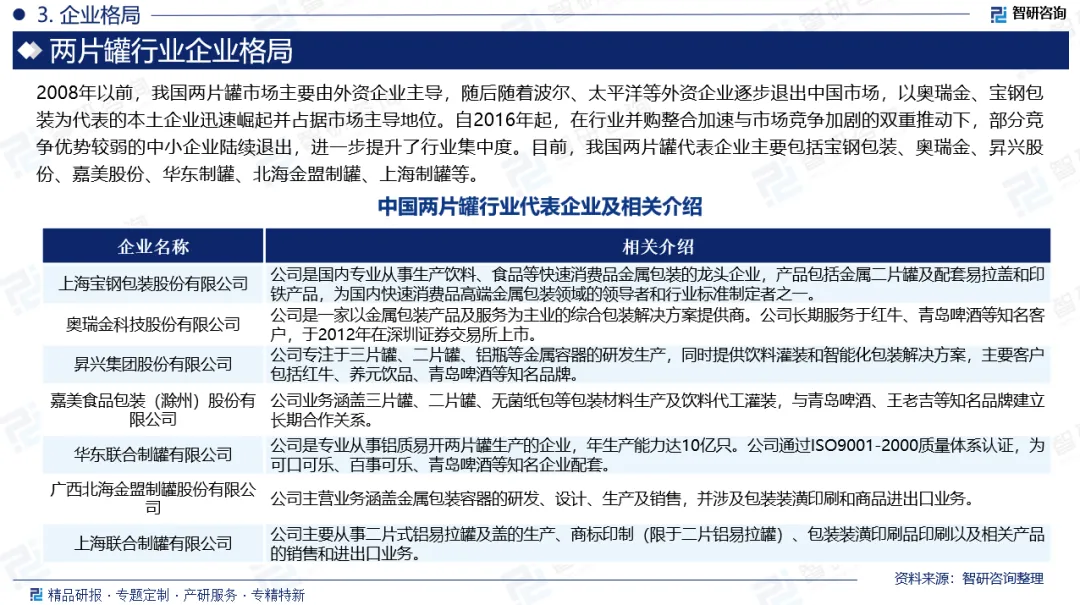 企业格局:2008年以前,我国两片罐市场主要由外资企业主导,随后随着波尔、太平洋等外资企业逐步退出中国市场,以奥瑞金、宝钢包装为代表的本土企业迅速崛起并占据市场主导地位。自2016年起,在行业并购整合加速与市场竞争加剧的双重推动下,部分竞争优势较弱的中小企业陆续退出,进一步提升了行业集中度。目前,我国两片罐代表企业主要包括宝钢包装、奥瑞金、昇兴股份、嘉美股份、华东制罐、北海金盟制罐、上海制罐等。