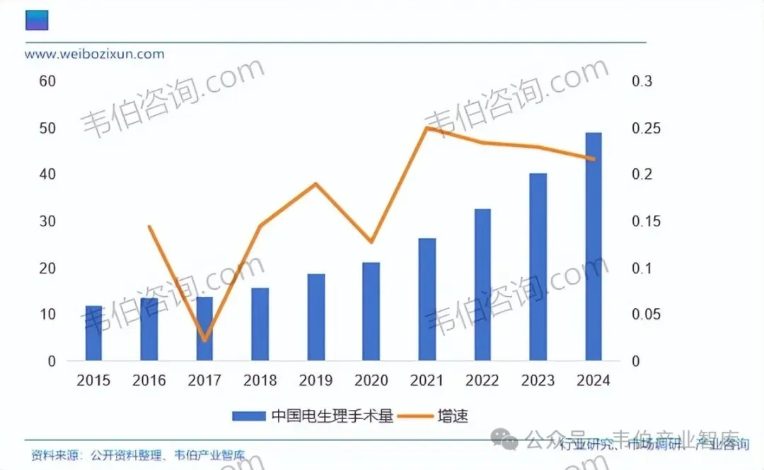 图表1:2015-2024年中国电生理手术量及增长趋势(万台,%)