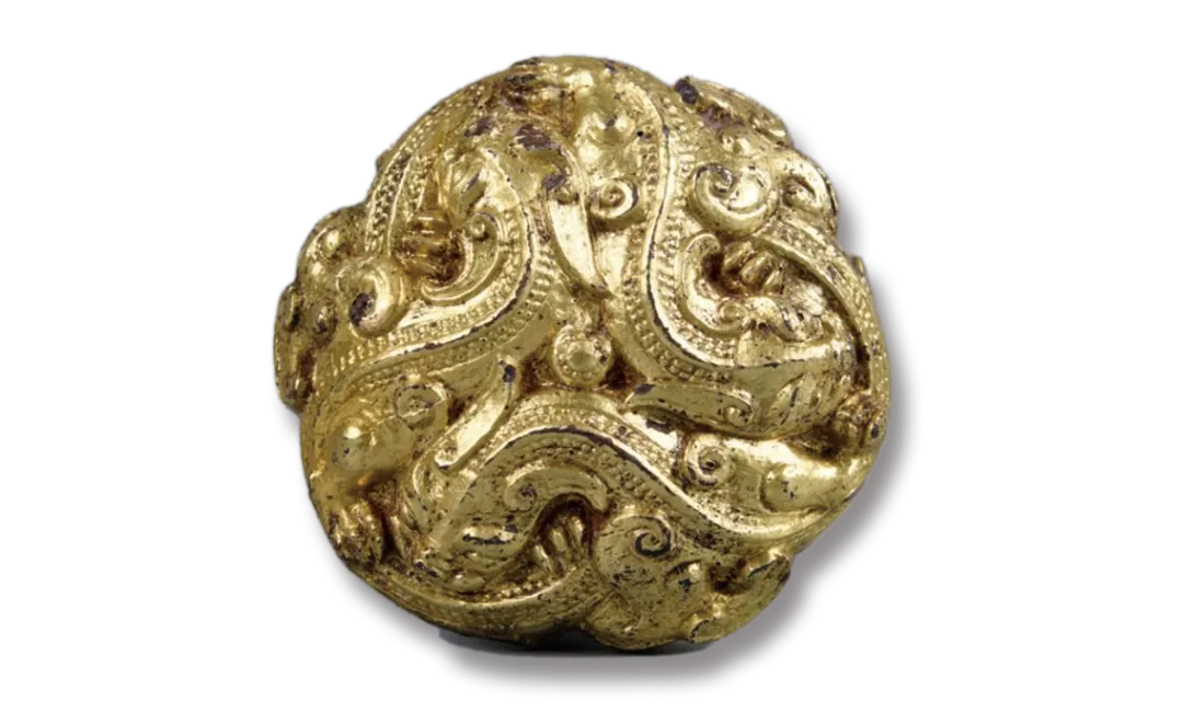 1997年新集乡白草洼出土,彭阳县博物馆馆藏鎏金夔龙纹青铜节约共2件,直径4.7厘米。整体是三条龙呈团簇状在云中相拥,面目清晰,脊体饰凸点纹,背有四桥型钮,通体鎏金。鎏金是将金和水银按照一定比例配置成合金膏泥(金汞齐),而后涂于器物表面,加热后水银挥发,金留在器物表面的工艺。节约本意是马辔头上用于连接马络首和辔带的配件,起到交叉联通皮带的作用,后衍生出了“节制、约束”之意,逐渐形成了现在我们所说的“节约用水用电”等固定用法。