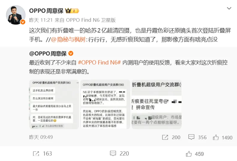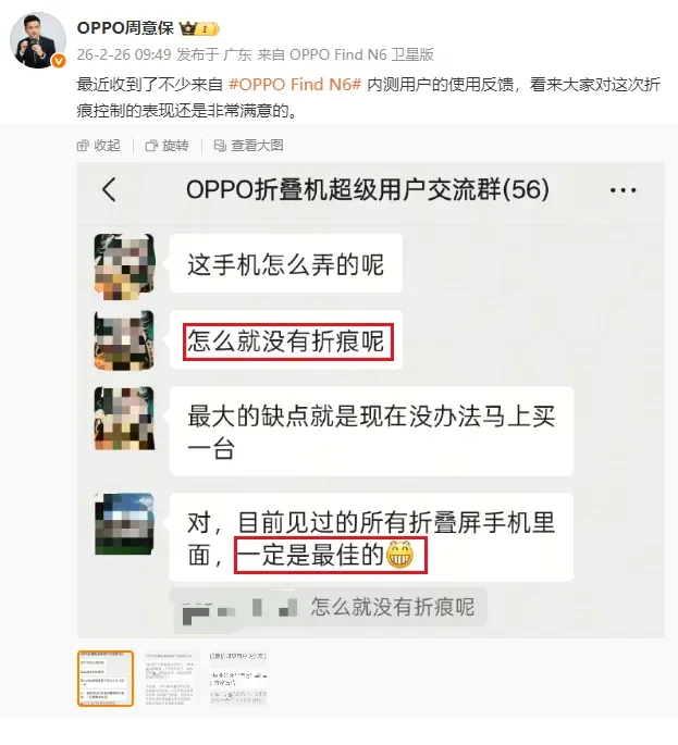Find N6预计3月亮相,目前内测用户对折痕控制的反馈相当满意。
