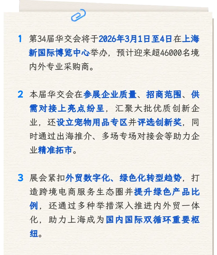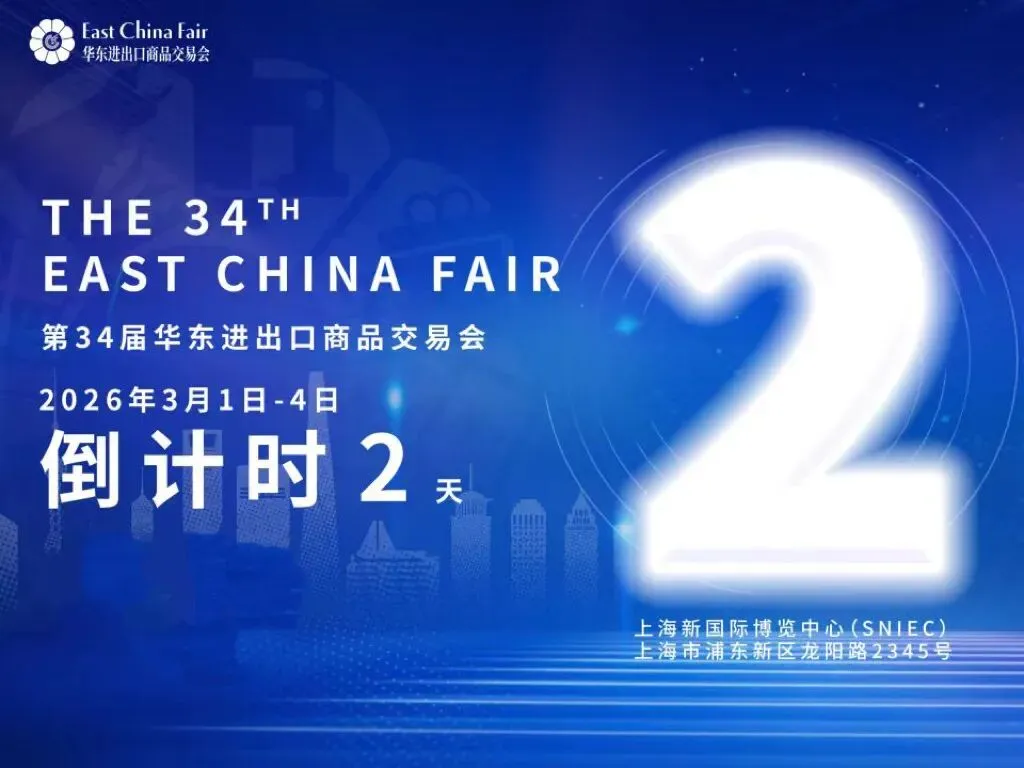 市商务委介绍,第34届华东进出口商品交易会(以下简称“华交会”)将于2026年3月1日至3月4日在上海新国际博览中心举办。
