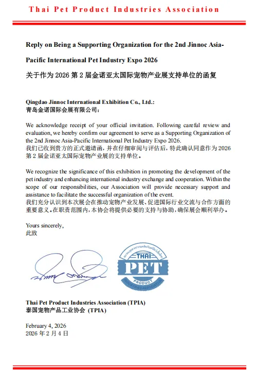 重磅消息!2026第二届金诺·亚太国际宠物产业展览会正式获得泰国宠物产品工业协会(TPIA)发函支持。与此同时,组委会正与日本、韩国等国的相关权威机构推进深度合作。