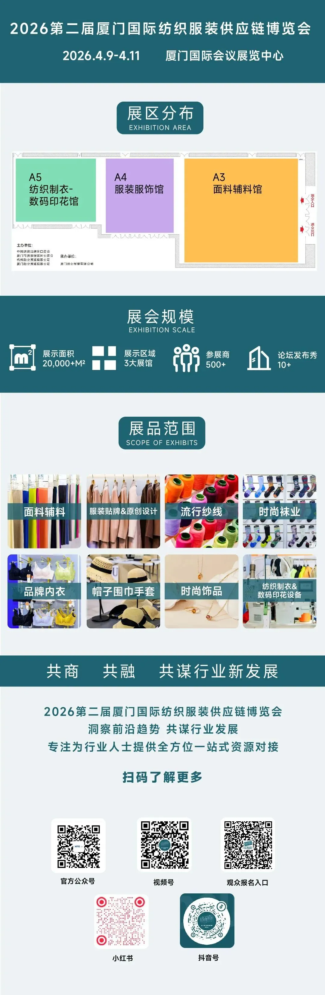 由中国纺织品进出口商会、厦门市纺织服装同业商会、杭州励业展览有限公司、厦门励业展览有限公司共同打造的2026第二届厦门国际纺织服装供应链博览会,定于2026年4月9日-11日,厦门国际会议展览中心(A3、A4、A5馆)隆重举行,预登记通道现已全面开启!