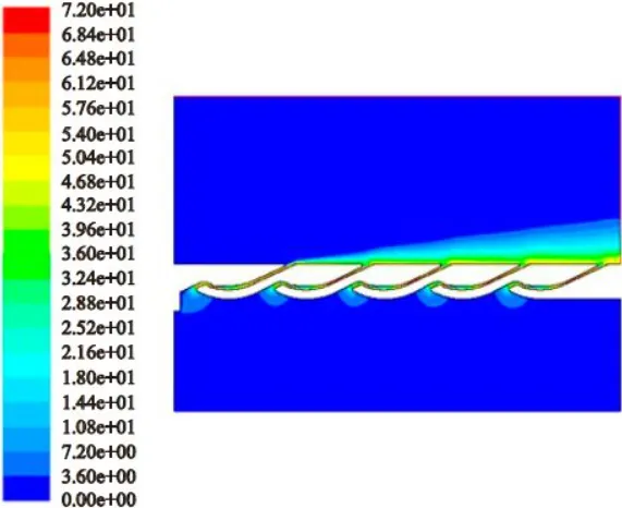 之前使用传统斜坡篦板,风穿过篦板后竖直向上进入熟料。换用Coanda-effect篦板,风室内的风穿过篦板后几乎水平进入熟料。一方面,由于喷射气流高速流过篦板表面,对热熟料和篦板起隔热层作用,篦板温度基本在30~40℃;另一方面,水平进入熟料的冷却风,在熟料中行走的路径更长,冷却风与熟料的热交换时间更长,热交换更充分,从而提高热回收效率。Coanda-effect篦板仿真模拟见图7。