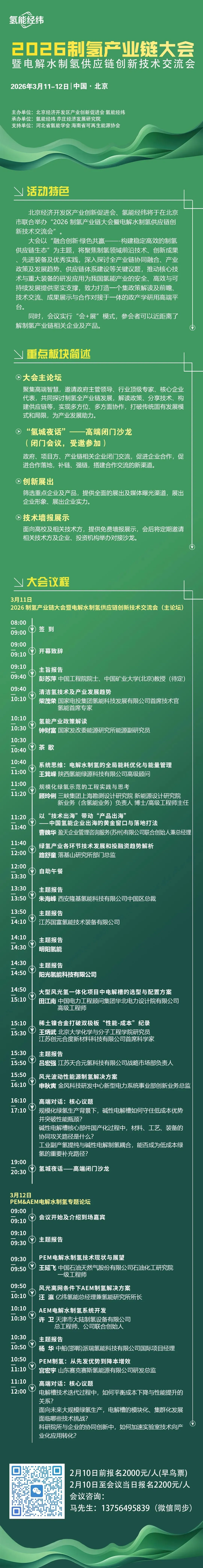 彭苏萍中国工程院院士、中国矿业大学(北京)教授(待定)柴茂荣 国家电投集团氢能科技发展有限公司首席技术官、氢能首席专家(确定)主题报告:系统思维—电解水制氢的全局能耗优化与能量管理顾玲俐三峡集团上海勘测设计研究院新能源设计研究院新业务(含氢能业务)负责人博士/高级工程师主任(确定)主题报告:以“技术出海”带动“产品出海”—中国氢能企业出海的黄金窗口与落地打法曹魏华 盈天企业管理咨询服务(苏州)有限公司联合创始人兼总经理(确定)朱海峰 西安隆基氢能科技有限公司中国区总裁(确定)主题报告:可再生能源制氢氨醇油气技术挑战与发展前景田江南 中国电力工程顾问集团华北电力设计院有限公司高级工程师(确定)王炳武 北京大学化学与分子工程学院研究员、江苏创元合度新材料科技有限公司首席科学家(确定)吕宏强 江苏天合元氢科技有限公司战略市场部负责人(确定)申秋寅 金风科技研发中心新型电力系统事业部创新业务总监(确定)~规模化绿氢生产背景下,碱性电解槽如何守住低成本优势并突破性能瓶颈?~碱性电解槽核心部件国产化过程中,材料、工艺、装备的协同攻关路径是什么?~工业副产氢提纯与碱性电解制氢耦合,能否成为低成本绿氢的重要补充路径?3月12日 PEM&AEM电解水制氢供应链专题论坛质子交换膜(PEM)电解水制氢技术推动绿氢产业高质量发展王延飞 中国石油天然气股份有限公司石油化工研究院一级工程师(确定)许 卫 天津市大陆制氢设备有限公司总工程师、公司联合创始人(确定)杨 华 中船(邯郸)派瑞氢能科技有限公司国际项目经理(确定)宫宏宇 山东赛克赛斯氢能源有限公司研发总监(确定)~电解槽技术迭代过程中,如何平衡成本下降与性能提升的关系?~面向未来大规模绿氢生产,电解槽的模块化、集群化发展面临哪些技术挑战?~科研院所与企业的协同创新中,如何加速实验室技术向产业化应用转化?(注:议程为初步议程,嘉宾及演讲具体题目以会议现场为准,议程持续更新中)参会费:2200元/人,2月10日前报名2000元/人,VIP门票:3800/人(含住宿、VIP前排席签)备注:参会费含会议费、资料费、午餐费、晚餐费(住宿费及交通费自理)。赞助费用:金牌赞助、资料袋赞助、礼品赞助、证件广告赞助等,详情咨询组委会。详情咨询