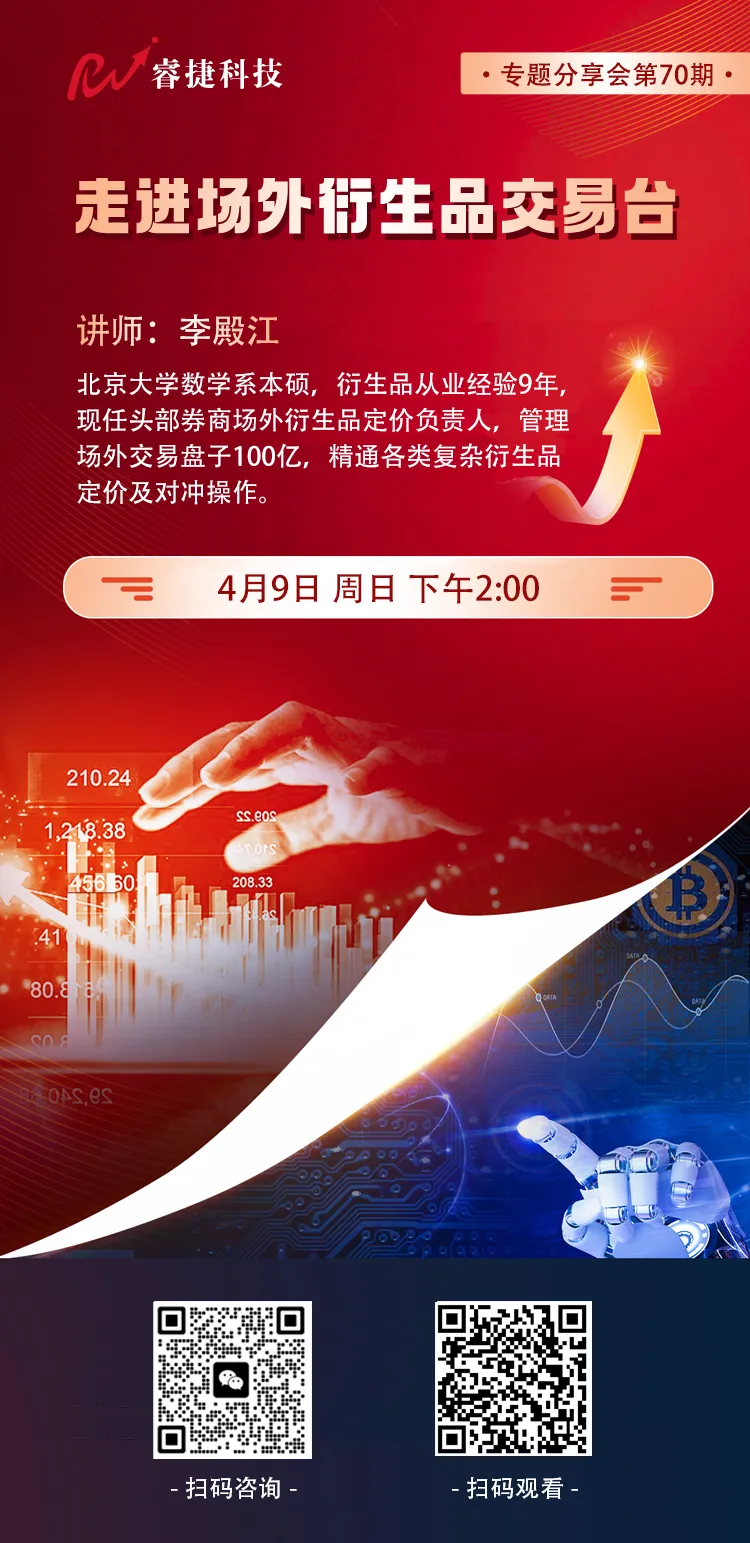 睿捷专题分享会第七十期,本期很荣幸邀请到头部券商场外衍生品定价负责人李殿江分享,本期主题——走进场外衍生品交易台。