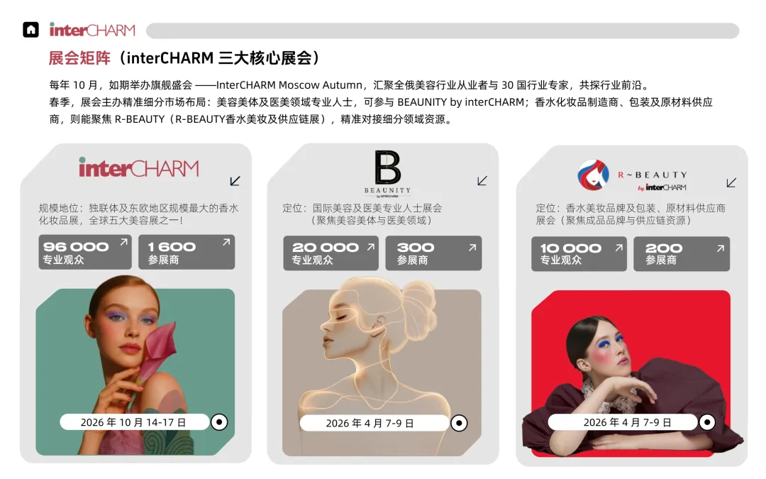 除了每年 10月 举办的旗舰展 InterCHARM Moscow Autumn 外,展会矩阵还包括:精准细分美容美体及医美领域的 BEAUNITY,以及深耕香水美妆供应链、包装及原材料的 R-BEAUTY。