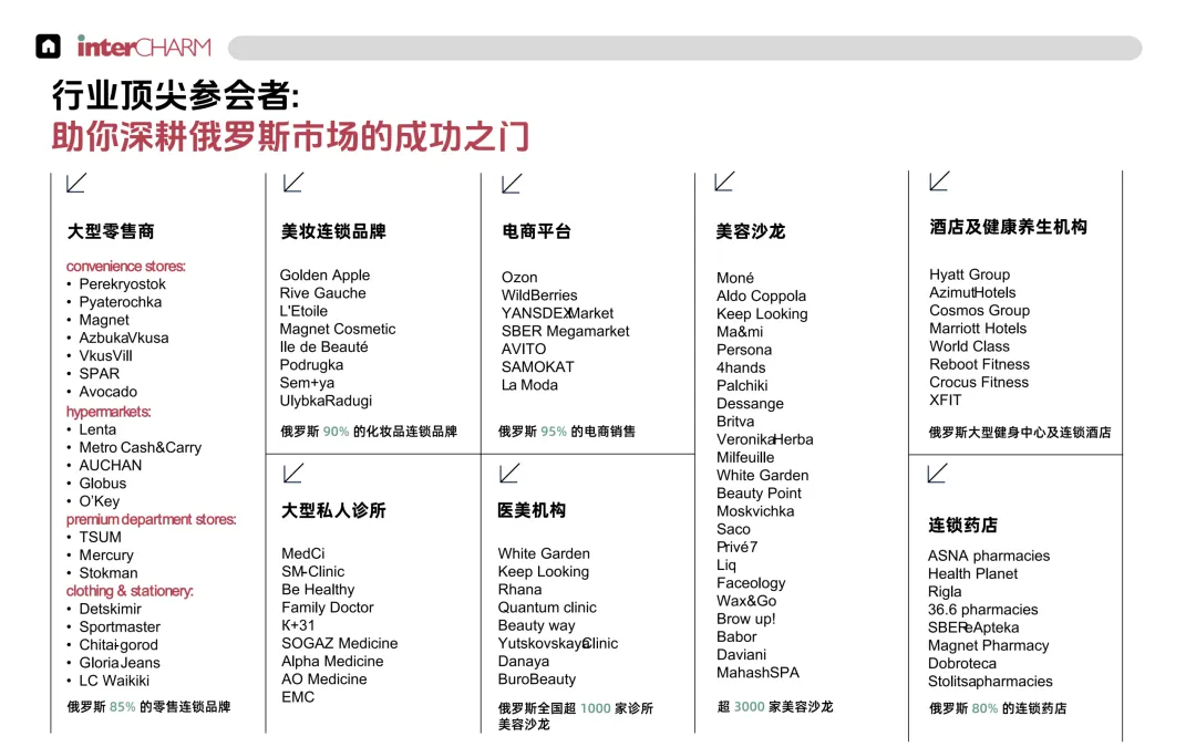 在 InterCHARM 现场,参展商可以直面 Golden Apple(金苹果)、L'Etoile、Rive Gauche 等垄断级零售连锁机构。这些连锁品牌覆盖了俄罗斯主流的化妆品零售份额。