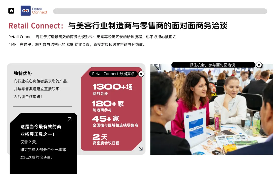 为了减少贸易信息不对称,InterCHARM 引入了核心 B2B 对接工具——Retail Connect。该工具旨在将非结构化的展会走访转化为精准、高效的商务谈判。