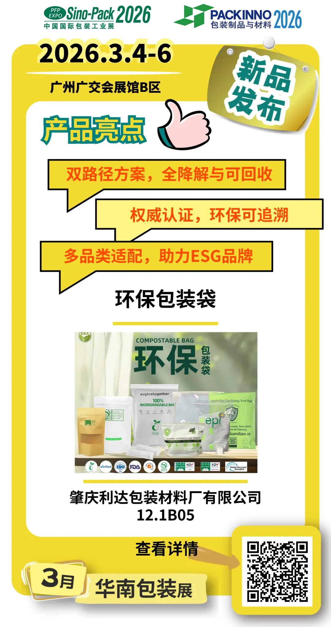 华南包装展汇集众多聚焦生物基、可降解、单一材质等环保包材,如丰原的生物基气凝晶保温材料,珠海优利的食品级降解覆膜,潮州吉祥膜业的单一材质自动包装热封 PE 膜,肇庆利达的环保包装袋……助您轻松应对全球绿色法规,塑造品牌环保形象。