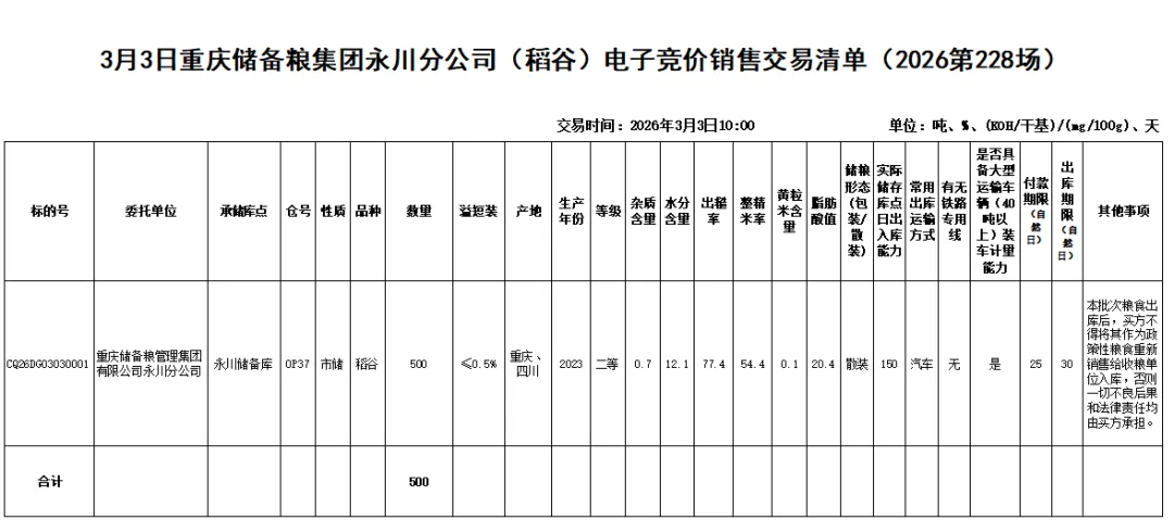 受重庆储备粮管理集团有限公司永川分公司委托,重庆市粮油批发市场有限责任公司(即国家粮食重庆交易中心,以下简称“批发市场公司”),定于2026年3月3日10:00举办重庆储备粮集团永川分公司(稻谷)电子竞价销售交易会,现将有关事项公告如下: